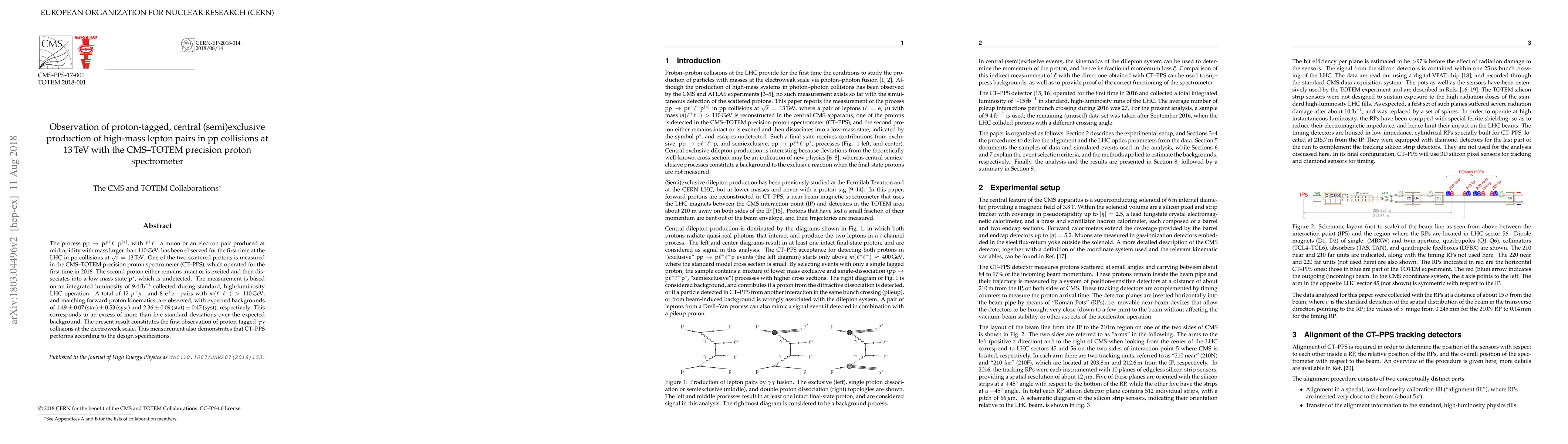 This paper reports the first observation of proton-tagged, central production of high-mass lepton pairs in proton-proton collisions at 13 TeV, using the CMS-TOTEM precision proton spectrometer. The CMS-TOTEM detector observed an excess of muon and electron pairs with masses over 110 GeV, confirming the first observation of electroweak scale $\gamma\gamma$ collisions.
