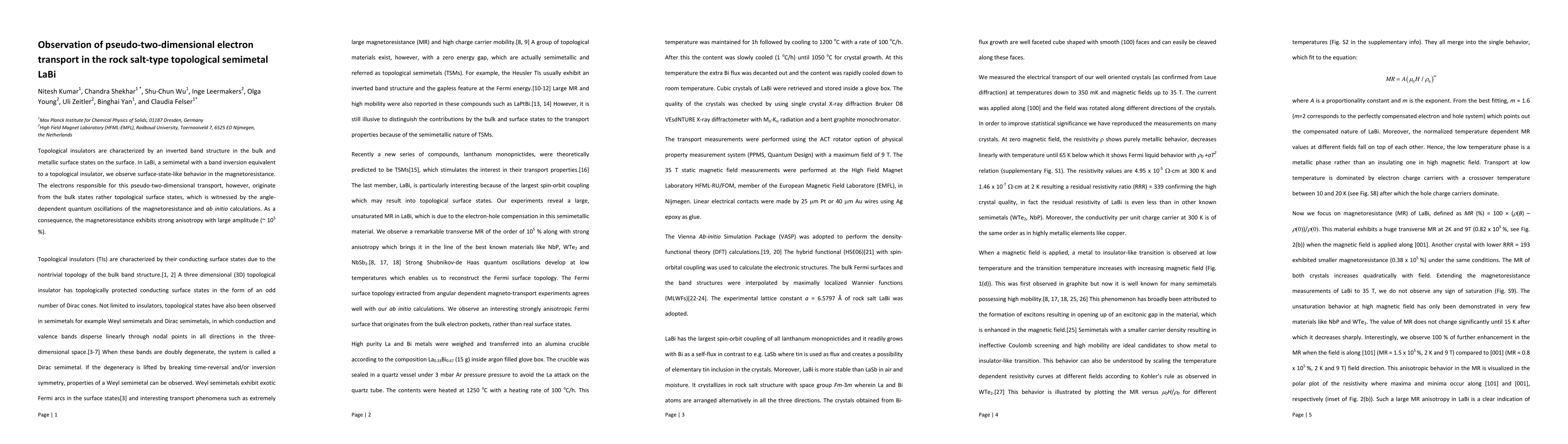 Topological insulators are characterized by an inverted band structure in the bulk and metallic surface states on the surface. In LaBi, a semimetal with a band inversion equivalent to a topological insulator, we observe surface state like behavior in the magnetoresistance. The electrons responsible for this pseudo two dimensional transport, however, originate from the bulk states rather topological surface states, which is witnessed by the angle dependent quantum oscillations of the magnetoresistance and ab initio calculations. As a consequence, the magnetoresistance exhibits strong anisotropy with large amplitude (~ 10^5 %).