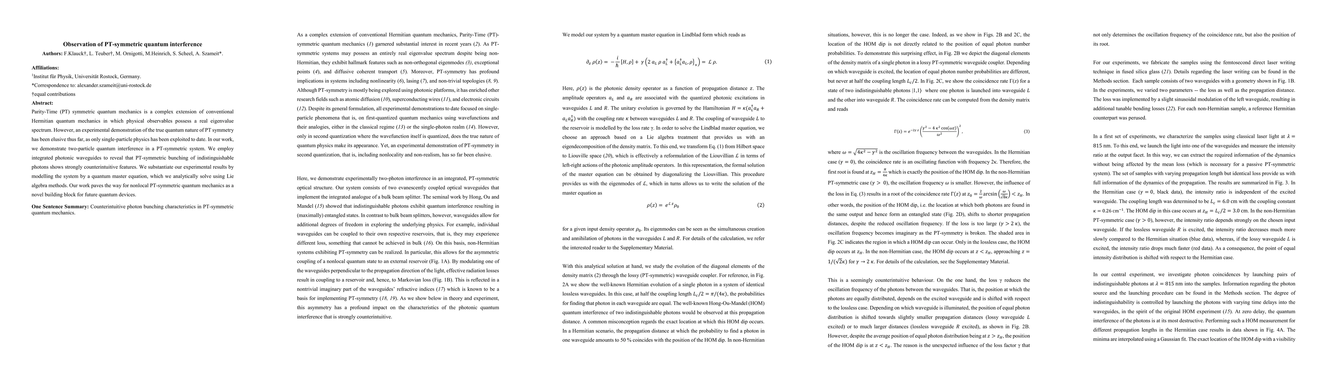 Parity-Time (PT) symmetric quantum mechanics is a complex extension of conventional Hermitian quantum mechanics in which physical observables possess a real eigenvalue spectrum. However, an experimental demonstration of the true quantum nature of PT symmetry has been elusive thus far, as only single-particle physics has been exploited to date. In our work, we demonstrate two-particle quantum interference in a PT-symmetric system. We employ integrated photonic waveguides to reveal that PT-symmetric bunching of indistinguishable photons shows strongly counterintuitive features. We substantiate our experimental results by modelling the system by a quantum master equation, which we analytically solve using Lie algebra methods. Our work paves the way for nonlocal PT-symmetric quantum mechanics as a novel building block for future quantum devices.