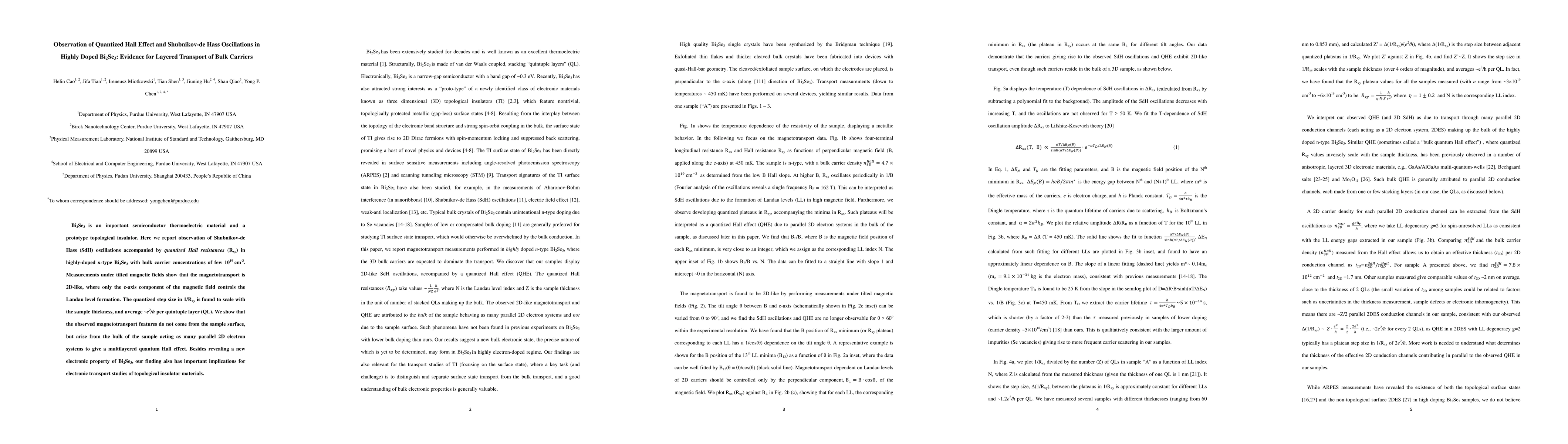 Bi2Se3 is an important semiconductor thermoelectric material and a prototype topological insulator. Here we report observation of Shubnikov-de Hass (SdH) oscillations accompanied by quantized Hall resistances (Rxy) in highly-doped n-type Bi2Se3 with bulk carrier concentrations of few 10^19 cm^-3. Measurements under tilted magnetic fields show that the magnetotransport is 2D-like, where only the c-axis component of the magnetic field controls the Landau level formation. The quantized step size in 1/Rxy is found to scale with the sample thickness, and average ~e2/h per quintuple layer (QL). We show that the observed magnetotransport features do not come from the sample surface, but arise from the bulk of the sample acting as many parallel 2D electron systems to give a multilayered quantum Hall effect. Besides revealing a new electronic property of Bi2Se3, our finding also has important implications for electronic transport studies of topological insulator materials.