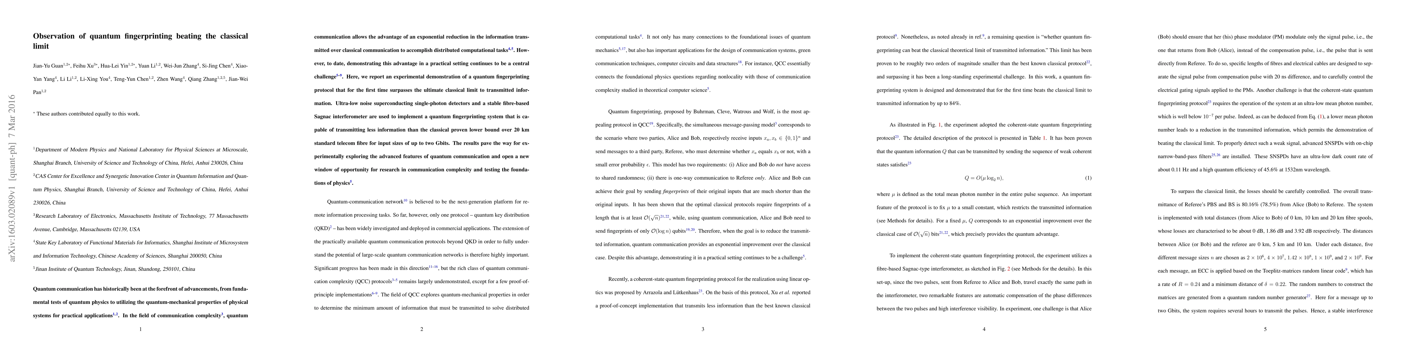 Quantum communication has historically been at the forefront of advancements, from fundamental tests of quantum physics to utilizing the quantum-mechanical properties of physical systems for practical applications. In the field of communication complexity, quantum communication allows the advantage of an exponential reduction in the information transmitted over classical communication to accomplish distributed computational tasks. However, to date, demonstrating this advantage in a practical setting continues to be a central challenge. Here, we report an experimental demonstration of a quantum fingerprinting protocol that for the first time surpasses the ultimate classical limit to transmitted information. Ultra-low noise superconducting single-photon detectors and a stable fibre-based Sagnac interferometer are used to implement a quantum fingerprinting system that is capable of transmitting less information than the classical proven lower bound over 20 km standard telecom fibre for input sizes of up to two Gbits. The results pave the way for experimentally exploring the advanced features of quantum communication and open a new window of opportunity for research in communication complexity and testing the foundations of physics.