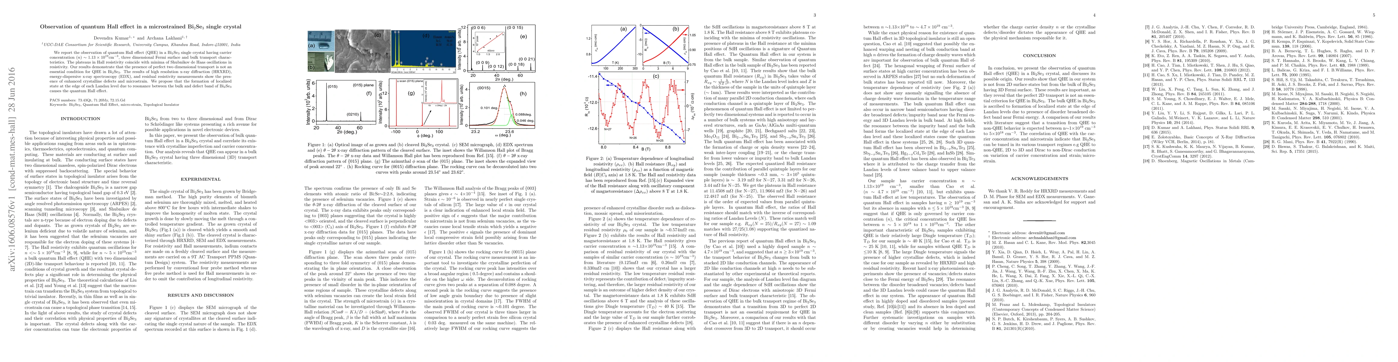 The research observes quantum Hall effect (QHE) in a microstrained Bi$_2$Se$_3$ single crystal with a carrier concentration of $\sim1.13\times10^{19}$ cm$^{-3}$, demonstrating that QHE can occur without perfect two-dimensional transport. The study attributes the effect to localized edge states formed by resonance between bulk and defect bands due to microstrain.