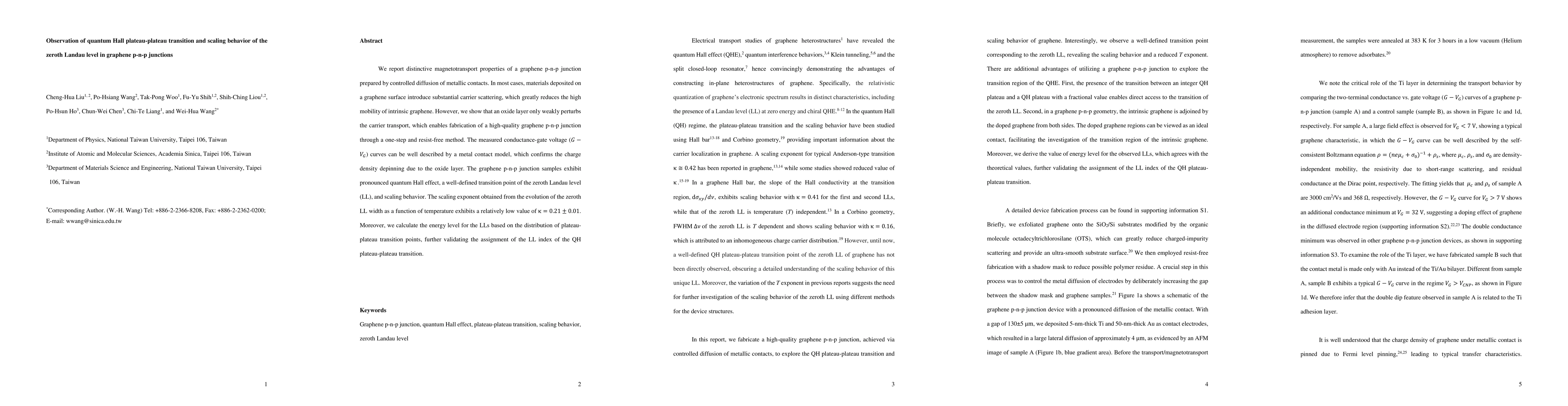 We report distinctive magnetotransport properties of a graphene p-n-p junction prepared by controlled diffusion of metallic contacts. In most cases, materials deposited on a graphene surface introduce substantial carrier scattering, which greatly reduces the high mobility of intrinsic graphene. However, we show that an oxide layer only weakly perturbs the carrier transport, which enables fabrication of a high-quality graphene p-n-p junction through a one-step and resist-free method. The measured conductance-gate voltage $(G-V_G)$ curves can be well described by a metal contact model, which confirms the charge density depinning due to the oxide layer. The graphene p-n-p junction samples exhibit pronounced quantum Hall effect, a well-defined transition point of the zeroth Landau level (LL), and scaling behavior. The scaling exponent obtained from the evolution of the zeroth LL width as a function of temperature exhibits a relatively low value of $\kappa=0.21\pm0.01$. Moreover, we calculate the energy level for the LLs based on the distribution of plateau-plateau transition points, further validating the assignment of the LL index of the QH plateau-plateau transition.