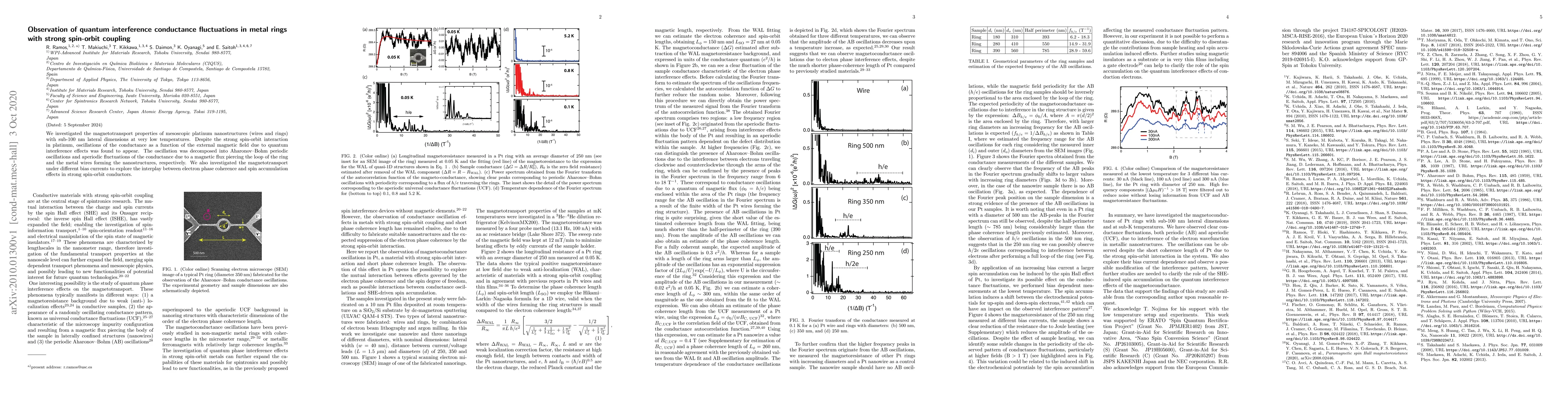 We investigated the magnetotransport properties of mesoscopic platinum nanostructures (wires and rings) with sub-100 nm lateral dimensions at very low temperatures. Despite the strong spin-orbit interaction in platinum, oscillations of the conductance as a function of the external magnetic field due to quantum interference effects was found to appear. The oscillation was decomposed into Aharonov-Bohm periodic oscillations and aperiodic fluctuations of the conductance due to a magnetic flux piercing the loop of the ring and the metal wires forming the nanostructures, respectively. We also investigated the magnetotransport under different bias currents to explore the interplay between electron phase coherence and spin accumulation effects in strong spin-orbit conductors.