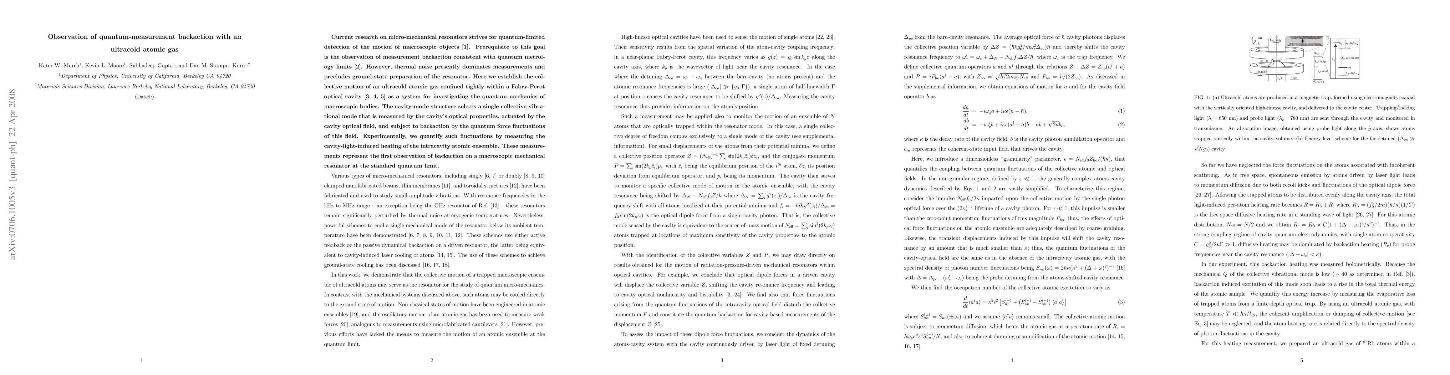 This research reports the first observation of quantum-measurement backaction on a macroscopic mechanical resonator, achieved by using an ultracold atomic gas within a Fabry-Perot optical cavity. The study demonstrates the cavity's ability to measure, actuate, and be backacted upon by the collective motion of the gas, thus reaching the quantum-metrology standard limit.