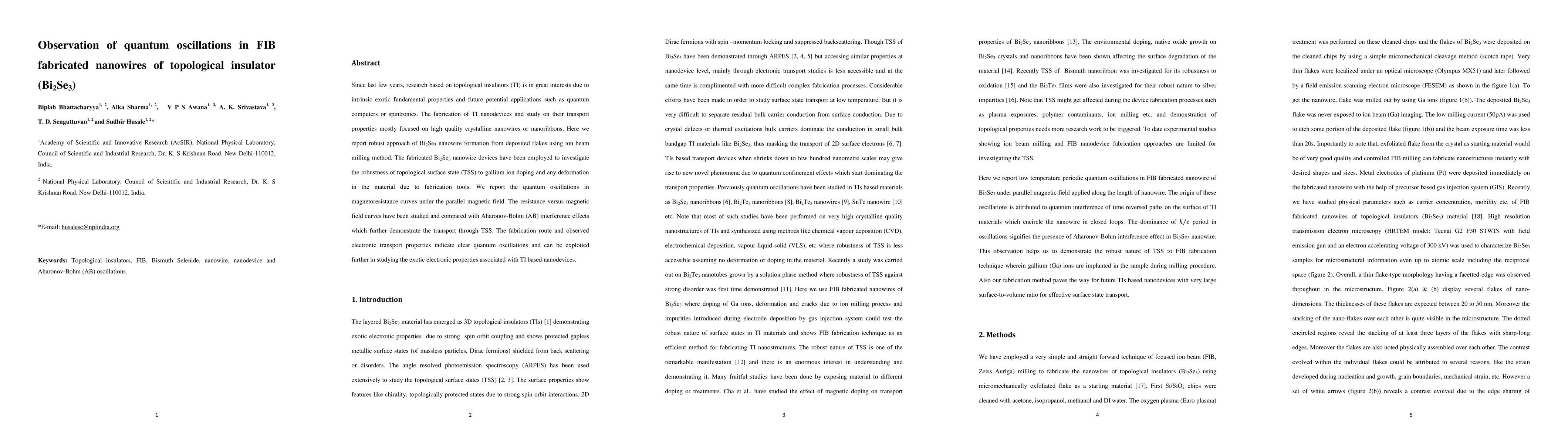 This paper reports the fabrication of Bi2Se3 nanowires using ion beam milling and investigates their quantum oscillations and topological surface state robustness. Quantum oscillations in magnetoresistance and Aharonov-Bohm interference effects observed suggest potential for future TI-based nanodevices.