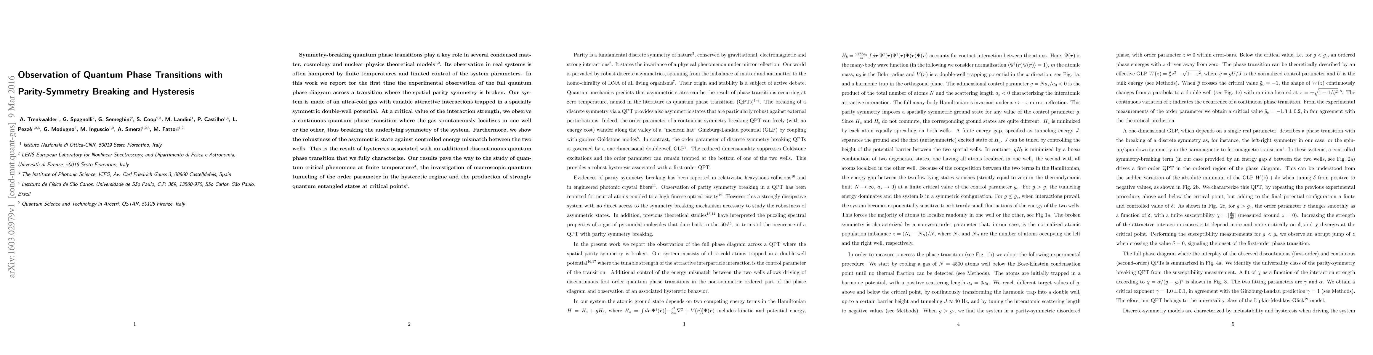 This paper reports the first experimental observation of a symmetry-breaking quantum phase transition in an ultra-cold gas system, demonstrating the transition's robustness through hysteresis and characterizing the associated discontinuous quantum phase transition. The findings open new avenues for studying quantum critical phenomena and quantum entanglement.