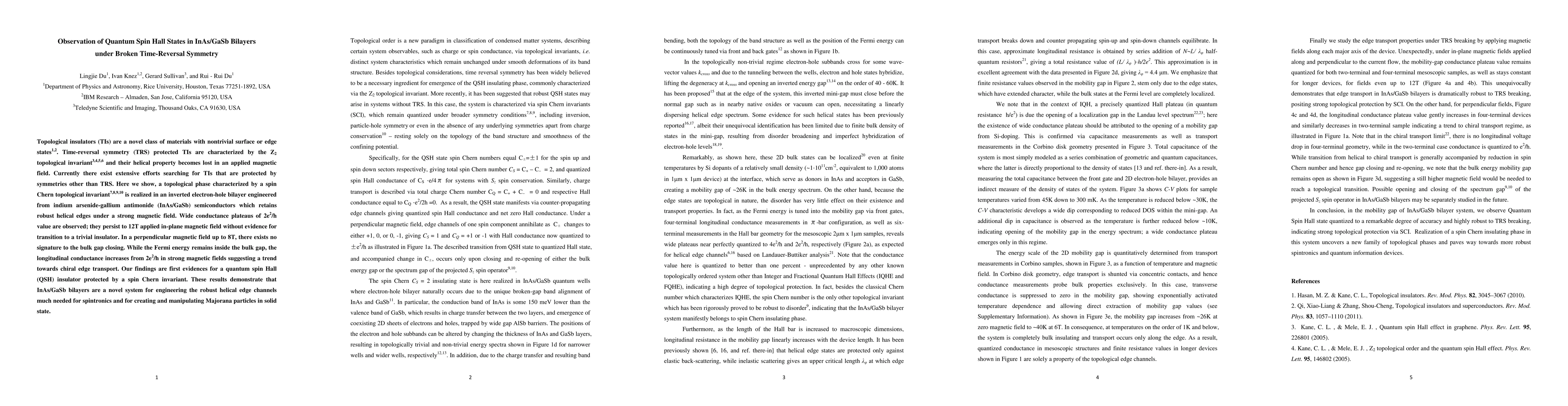 This paper reports the observation of quantum spin Hall states in InAs/GaSb bilayers, demonstrating topological phase protection by a spin Chern invariant. The system exhibits robust helical edge states and conductance plateaus under strong magnetic fields, indicating potential for spintronics and Majorana particle manipulation.