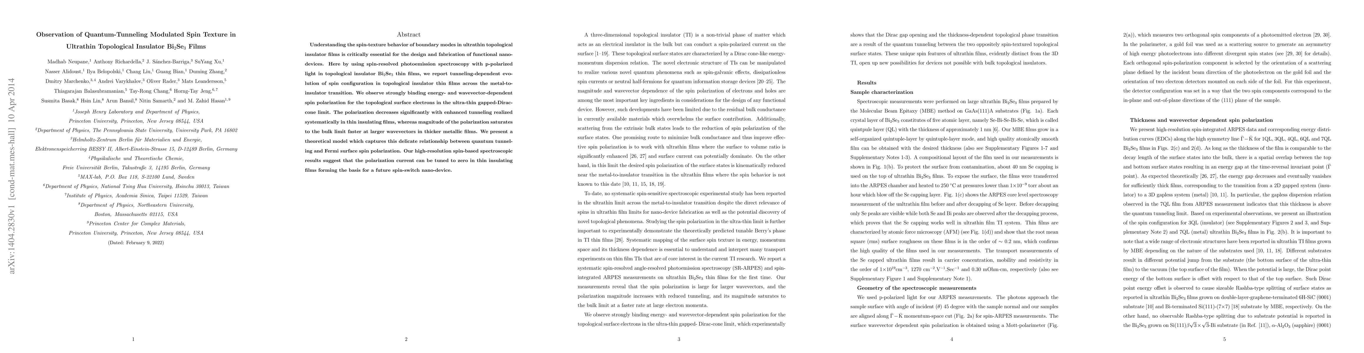 This paper reports on the spin-texture behavior in ultrathin topological insulator Bi2Se3 films, observing a quantum-tunneling modulated spin polarization that diminishes with thinner insulating films, while thicker metallic films reach bulk polarization faster at larger wavevectors. A theoretical model correlates quantum tunneling with Fermi surface spin polarization, suggesting potential for tunable spin-switch nano-devices.