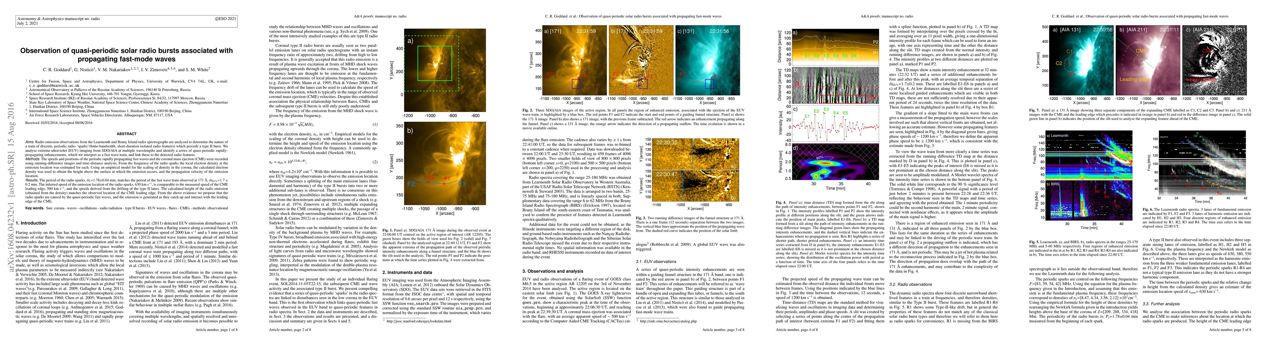 This paper observes quasi-periodic solar radio bursts linked to fast-mode waves, finding that the period of radio "sparks" matches the period of observed fast wave trains. The study concludes that the radio sparks are generated by these fast waves interacting with the leading edge of a coronal mass ejection.