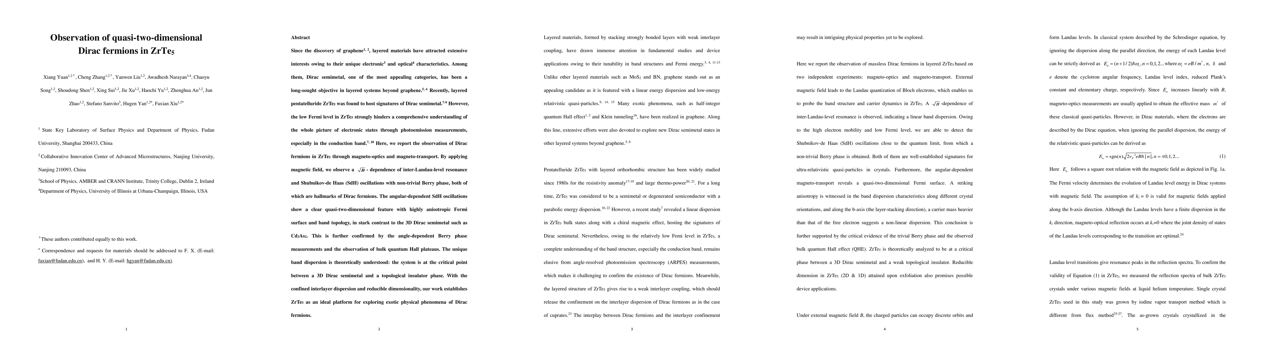 The paper reports the observation of quasi-two-dimensional Dirac fermions in ZrTe5 through magneto-optics and magneto-transport, revealing a highly anisotropic Fermi surface and band topology, and positioning ZrTe5 at the critical point between a 3D Dirac semimetal and a topological insulator phase.