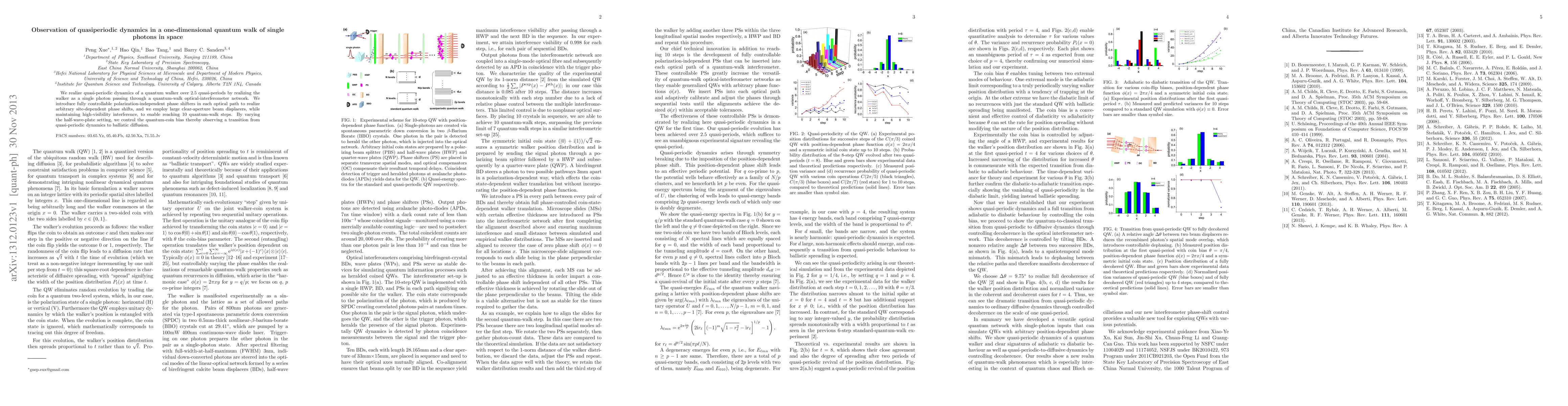 We realize quasi-periodic dynamics of a quantum walker over 2.5 quasi-periods by realizing the walker as a single photon passing through a quantum-walk optical-interferometer network. We introduce fully controllable polarization-independent phase shifters in each optical path to realize arbitrary site-dependent phase shifts, and we employ large clear-aperture beam displacers, while maintaining high-visibility interference, to enable reaching 10 quantum-walk steps. By varying the half-wave-plate setting, we control the quantum-coin bias thereby observing a transition from quasi-periodic dynamics to ballistic diffusion.