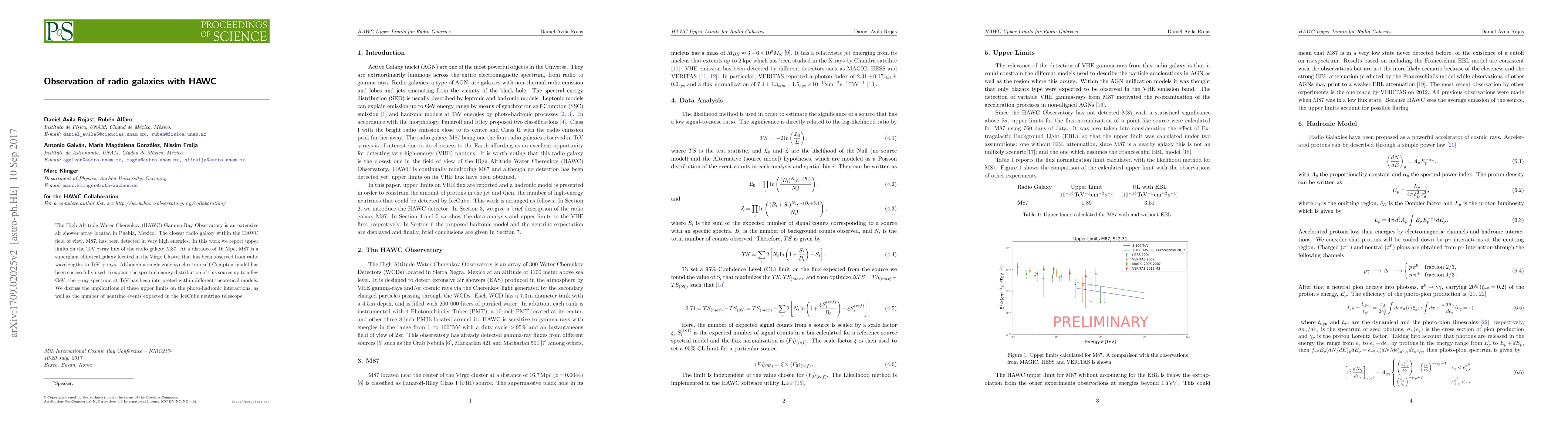 The High Altitude Water Cherenkov (HAWC) Gamma-Ray Observatory is an extensive air shower array located in Puebla, Mexico. The closest radio galaxy within the HAWC field of view, M87, has been detected in very high energies. In this work we report upper limits on the TeV {\gamma}-ray flux of the radio galaxy M87. At a distance of 16 Mpc, M87 is a supergiant elliptical galaxy located in the Virgo Cluster that has been observed from radio wavelengths to TeV {\gamma}-rays. Although a single-zone synchrotron self-Compton model has been successfully used to explain the spectral energy distribution of this source up to a few GeV, the {\gamma}-ray spectrum at TeV has been interpreted within different theoretical models. We discuss the implications of these upper limits on the photo-hadronic interactions, as well as the number of neutrino events expected in the IceCube neutrino telescope.