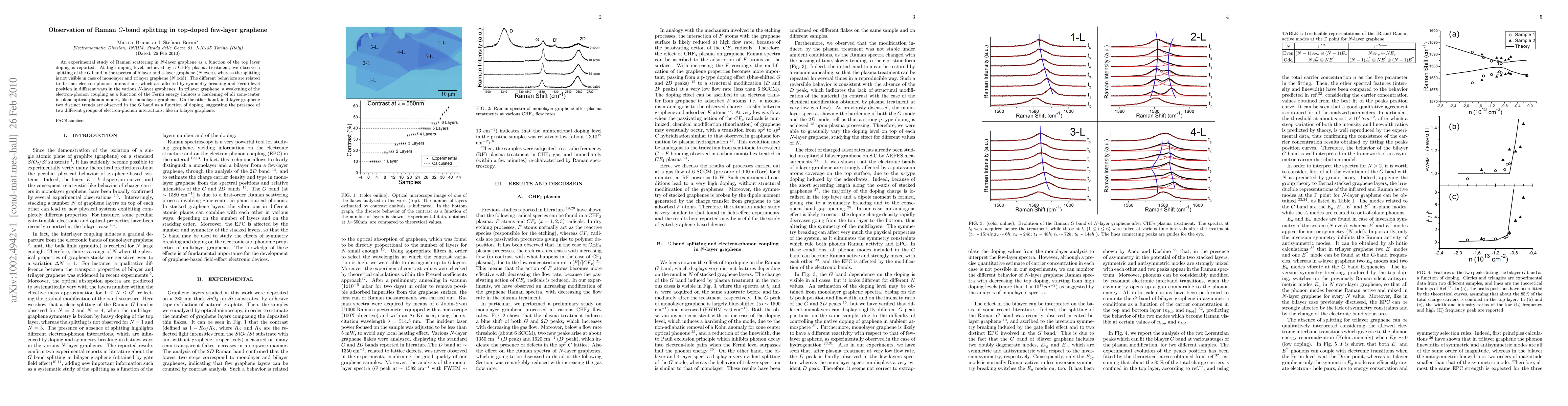 This study observes Raman G-band splitting in top-doped few-layer graphene, showing that high doping levels lead to splitting in even-layer graphene but not in odd-layer configurations. The differing behaviors are attributed to variations in electron-phonon interactions influenced by symmetry breaking and Fermi level positioning.