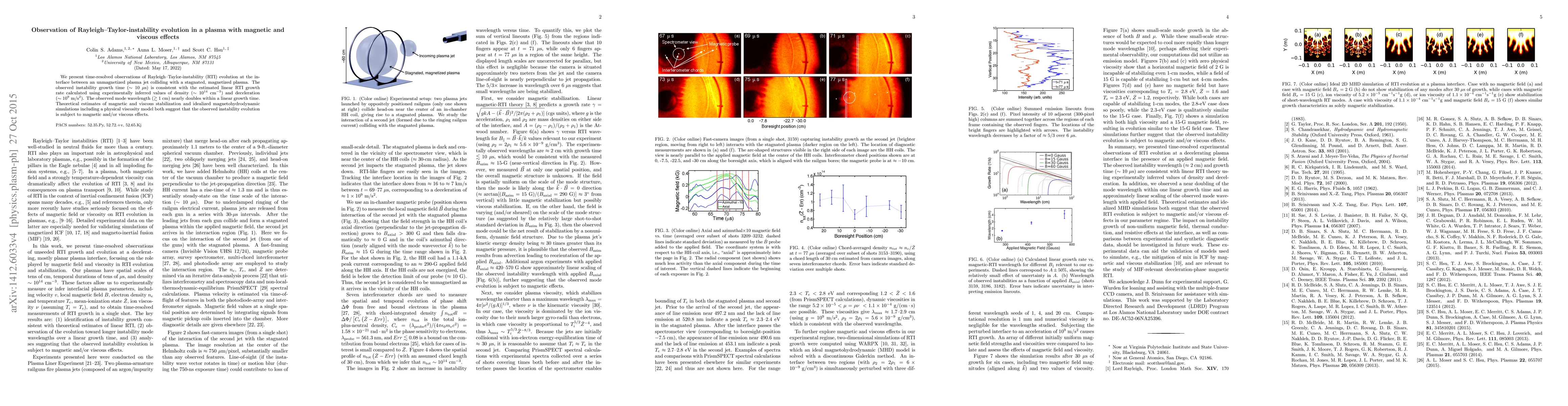 Researchers observed Rayleigh-Taylor instability evolution in a plasma with magnetic and viscous effects, finding growth times consistent with theoretical predictions and suggesting stabilization due to these factors.