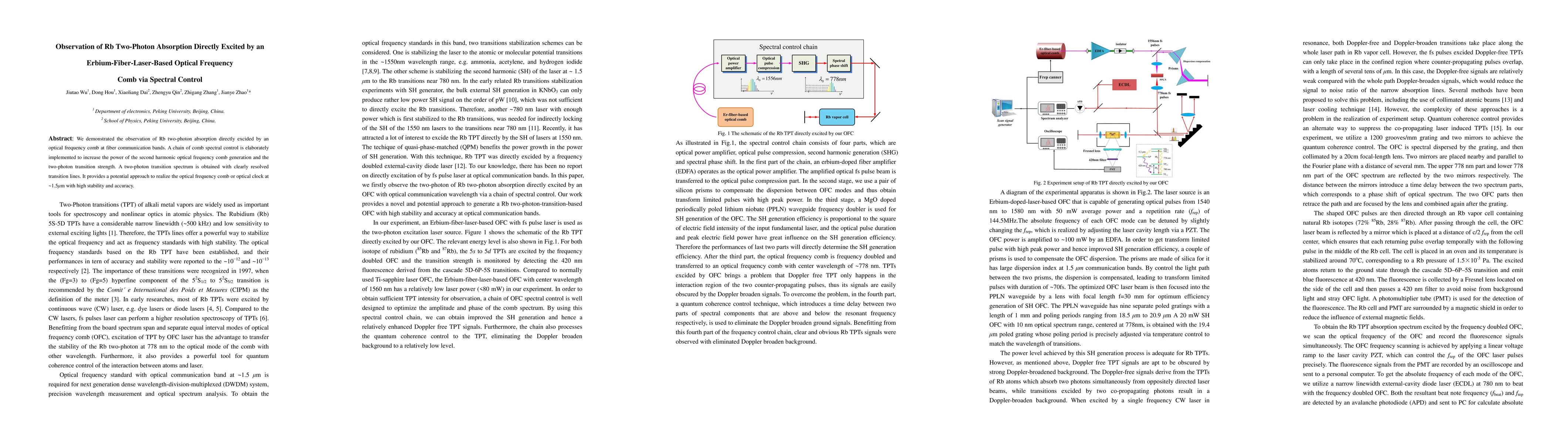 This research demonstrates the observation of Rb two-photon absorption using an erbium-fiber-laser-based optical frequency comb, achieving enhanced power through spectral control. The study reveals clearly resolved two-photon transition lines, suggesting a viable method for high-stability optical frequency combs or clocks at ~1.5μm.