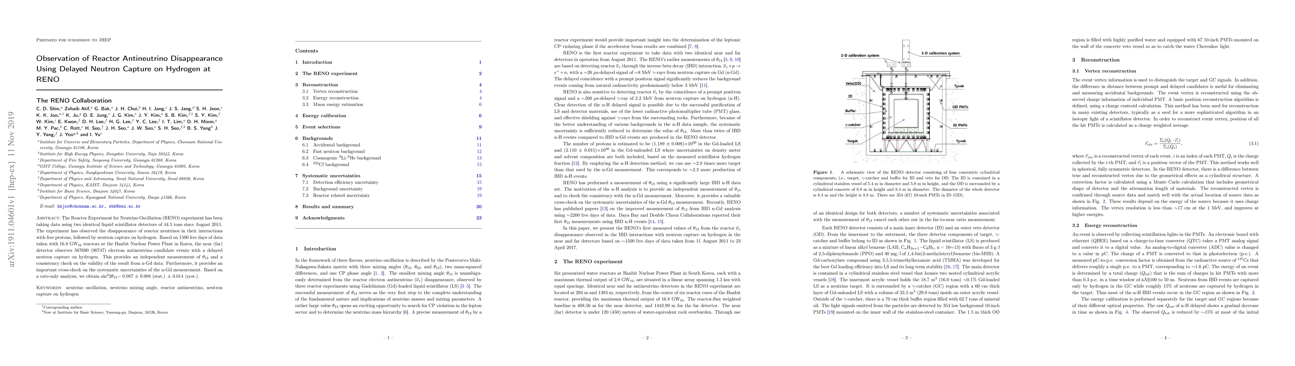The RENO experiment observes reactor antineutrino disappearance via delayed neutron capture on hydrogen, yielding sin$^{2}$2$\theta_{13}$ = 0.087 $\pm$ 0.008 (stat.) $\pm$ 0.014 (syst.), and provides an independent measurement and systematic uncertainty check for the $\theta_{13}$ mixing angle.