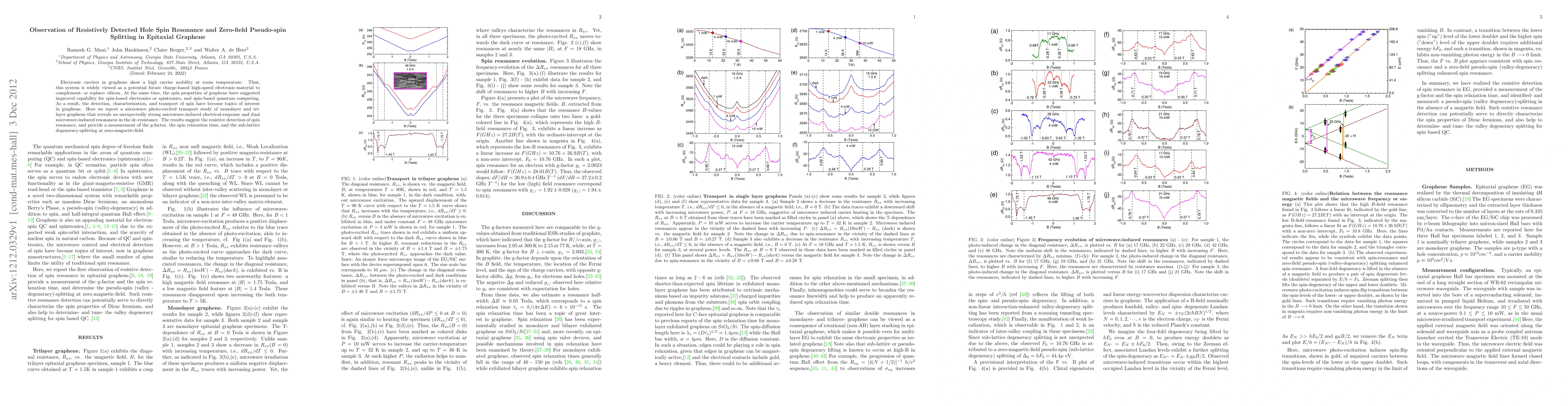 Electronic carriers in graphene show a high carrier mobility at room temperature. Thus, this system is widely viewed as a potential future charge-based high-speed electronic-material to complement- or replace- silicon. At the same time, the spin properties of graphene have suggested improved capability for spin-based electronics or spintronics, and spin-based quantum computing. As a result, the detection, characterization, and transport of spin have become topics of interest in graphene. Here we report a microwave photo-excited transport study of monolayer and trilayer graphene that reveals an unexpectedly strong microwave-induced electrical-response and dual microwave-induced resonances in the dc-resistance. The results suggest the resistive detection of spin resonance, and provide a measurement of the g-factor, the spin relaxation time, and the sub-lattice degeneracy-splitting at zero-magnetic-field.