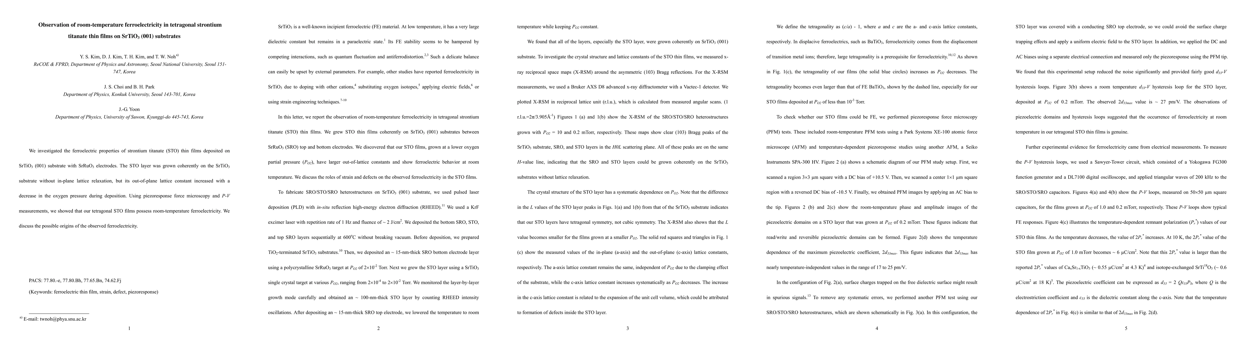 This paper investigates the ferroelectric properties of tetragonal strontium titanate thin films on SrTiO3 substrates, demonstrating room-temperature ferroelectricity through piezoresponse force microscopy and P-V measurements. The study explores the origins of this ferroelectricity despite coherent growth without in-plane lattice relaxation.