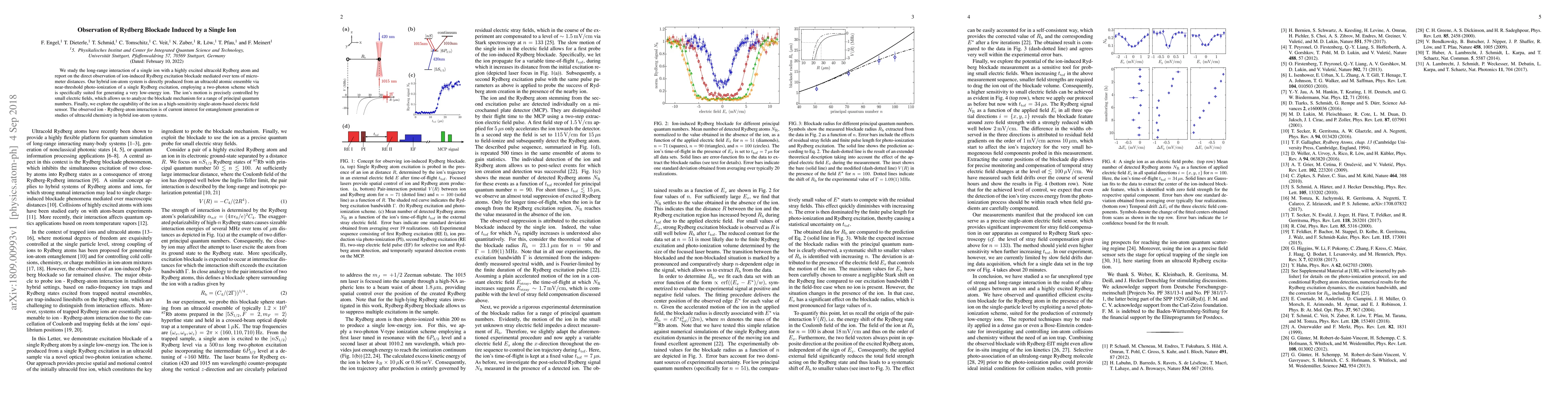 This paper observes Rydberg blockade induced by a single ion, demonstrating long-range interaction over micrometers in a hybrid ion-atom system. The study employs a two-photon scheme for precise control and analyzes the blockade mechanism across different quantum numbers, highlighting potential applications in entanglement and ultracold chemistry.