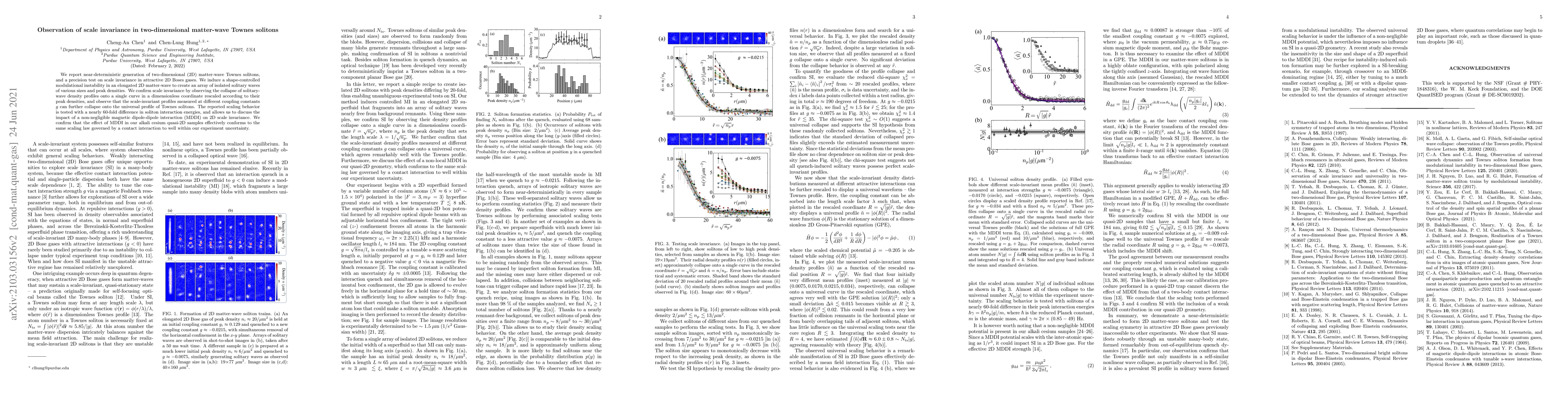 This paper reports the near-deterministic generation of two-dimensional matter-wave Townes solitons and confirms their scale invariance through precise measurements, showing that soliton profiles collapse onto a single curve when rescaled according to peak densities. The study also examines the impact of magnetic dipole-dipole interactions on scale invariance, finding that these effects conform to the same scaling law as contact interactions.
