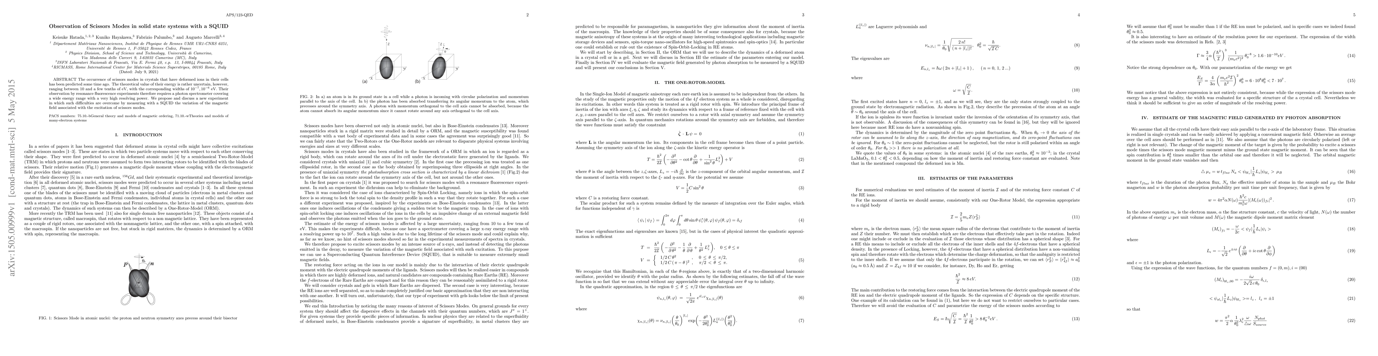 The occurrence of scissors modes in crystals that have deformed ions in their cells has been predicted some time ago. The theoretical value of their energy is rather uncertain, however, ranging between 10 and a few tenths of eV, with the corresponding widths of 10^-7, 10^-6 eV. Their observation by resonance fluorescence experiments therefore requires a photon spectrometer covering a wide energy range with a very high resolving power. We propose and discuss a new experiment in which such difficulties are overcome by measuring with a SQUID the variation of the magnetic field associated with the excitation of scissors modes.
