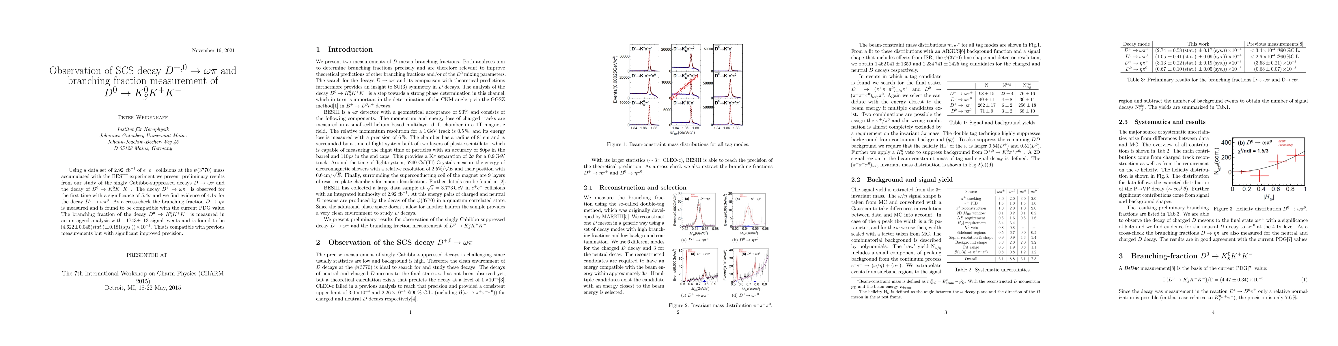 Using a data set of 2.92 $fb^{-1}$ of $e^+e^-$ collisions at the $\Psi$(3770) mass accumulated with the BESIII experiment we present preliminary results from our study of the singly Cabibbo-suppressed decays $D\to\omega\pi$ and the decay of $D^0\to K_S^0K^+K^-$. The decay $D^+\to\omega\pi^+$ is observed for the first time with a significance of 5.4$\sigma$ and we find evidence of 4.1$\sigma$ for the decay $D^0\to\omega\pi^0$. As a cross-check the branching fraction $D\to\eta\pi$ is measured and is found to be compatible with the current PDG value. The branching fraction of the decay $D^0\to K_S^0K^+K^-$ is measured in an untagged analysis with 11743$\pm$113 signal events and is found to be (4.622$\pm$0.045(stat.)$\pm$0.181(sys.))$\times 10^{-3}$. This is compatible with previous measurements but with significant improved precision.