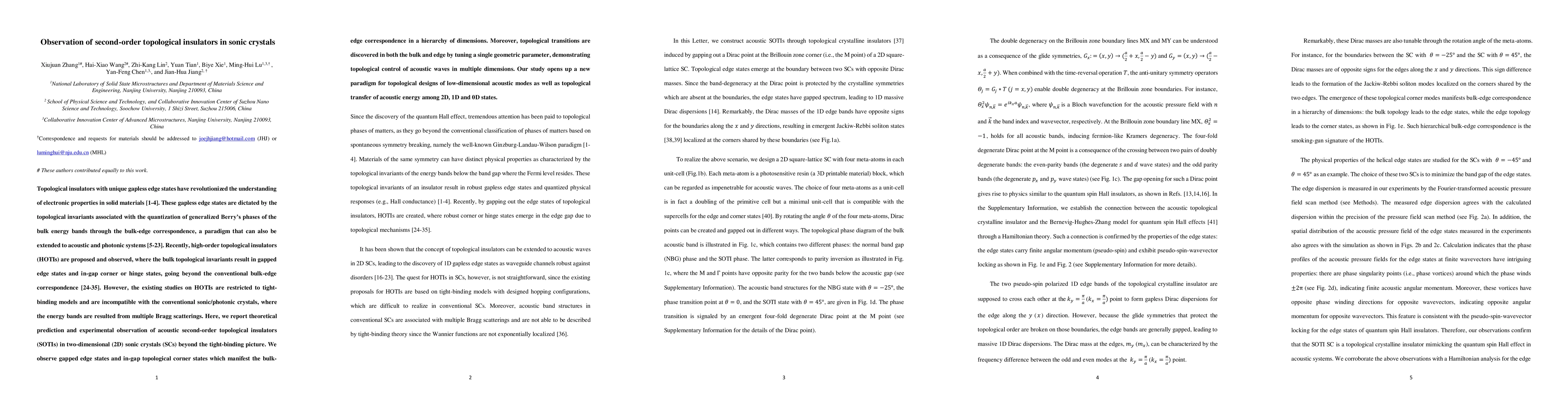 This research reports the theoretical prediction and experimental observation of acoustic second-order topological insulators (SOTI) in 2D sonic crystals, demonstrating gapped edge states and degenerate in-gap corner states beyond tight-binding models. It reveals topological transitions achievable by adjusting meta-atom angles, suggesting new pathways for robust localized acoustic modes and topological energy transfer.