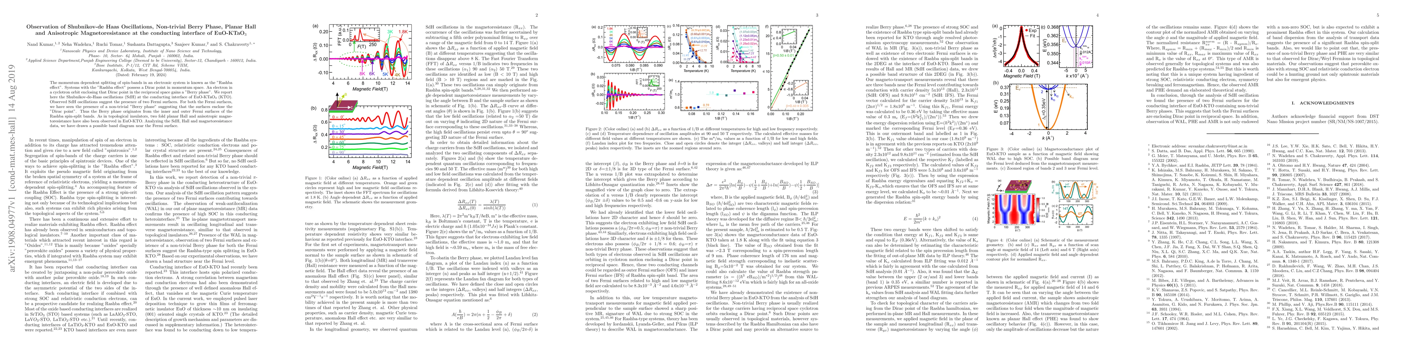 The momentum dependent splitting of spin-bands in an electronic system is known as the "Rashba effect". Systems with the "Rashba effect" possess a Dirac point in momentum space. An electron in a cyclotron orbit enclosing that Dirac point in the reciprocal space gains a "Berry phase". We report here the Shubnikov-de-Haas oscillations (SdH) at the conducting interface of EuO-KTaO$_3$ (KTO). Observed SdH oscillations suggest the presence of two Fermi surfaces. For both the Fermi surfaces, we have seen the presence of a non-trivial "Berry phase" suggesting that the surfaces enclose the "Dirac point". Thus the Berry phase originates from the inner and outer Fermi surfaces of the Rashba spin-split bands. As in topological insulators, two fold planar Hall and anisotropic magnetoresistance have also been observed in EuO-KTO. Analyzing the SdH, Hall and magnetoresistance data, we have drawn a possible band diagram near the Fermi surface.