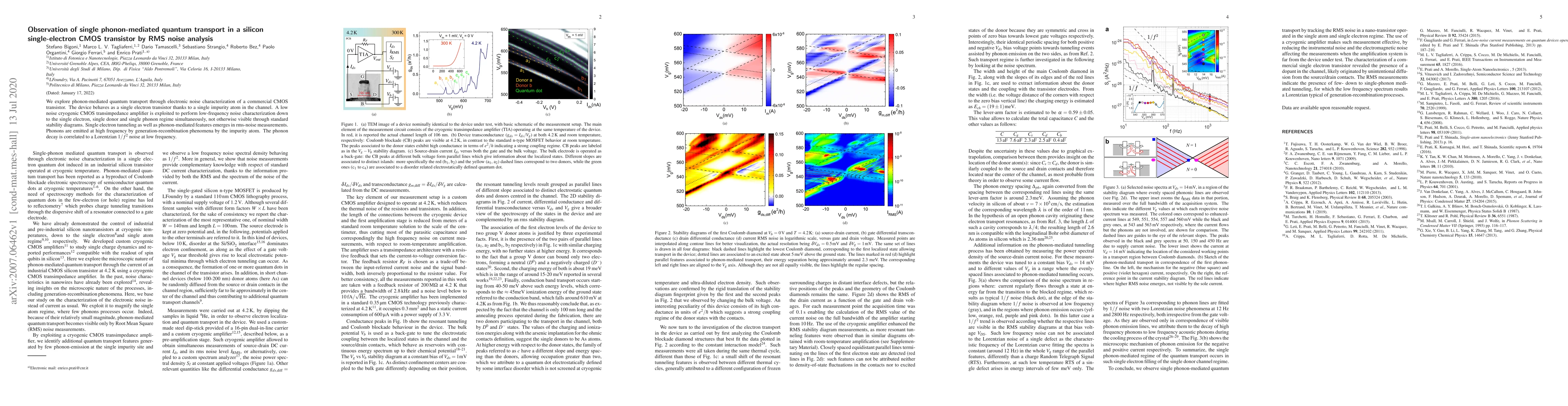 This paper investigates phonon-mediated quantum transport in a silicon single-electron CMOS transistor using RMS noise analysis. The study reveals single electron tunneling and phonon-mediated features through low-frequency noise characterization, facilitated by a cryogenic CMOS transimpedance amplifier.