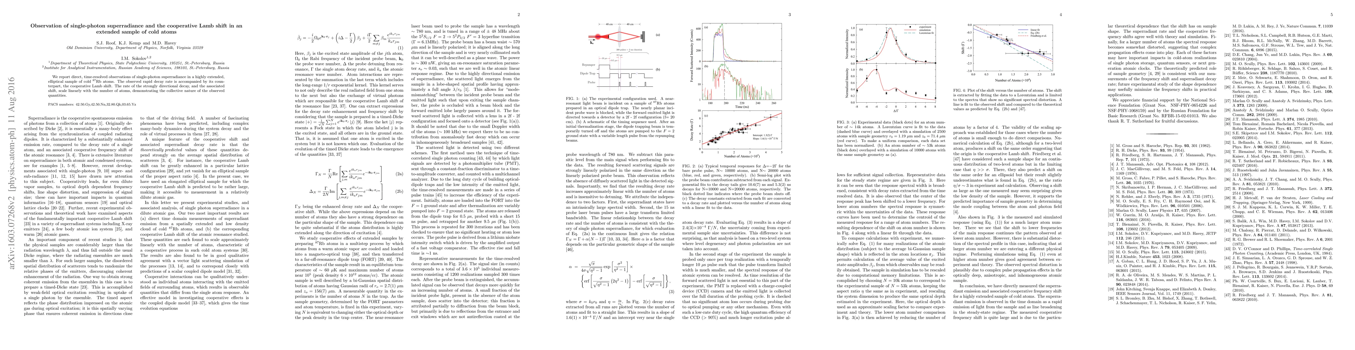 This paper reports direct observations of single-photon superradiance and the cooperative Lamb shift in a large sample of cold 87Rb atoms, demonstrating the collective nature of these phenomena through their linear scaling with atom number and dependence on sample shape.