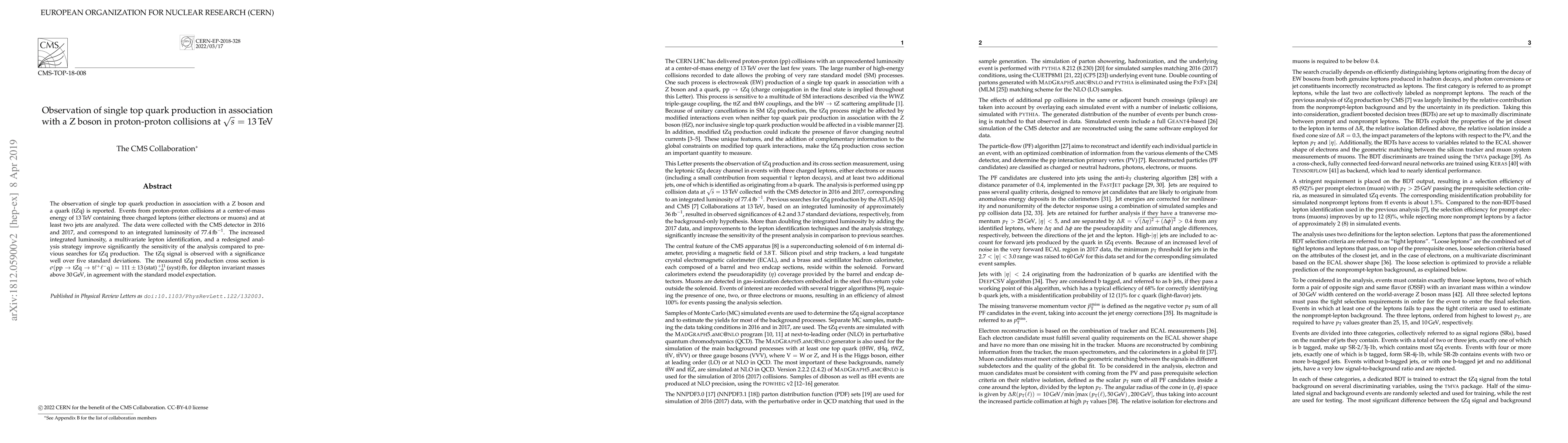 The CMS detector observed single top quark production in association with a Z boson at 13 TeV, confirming the Standard Model expectation with a high significance and precision.