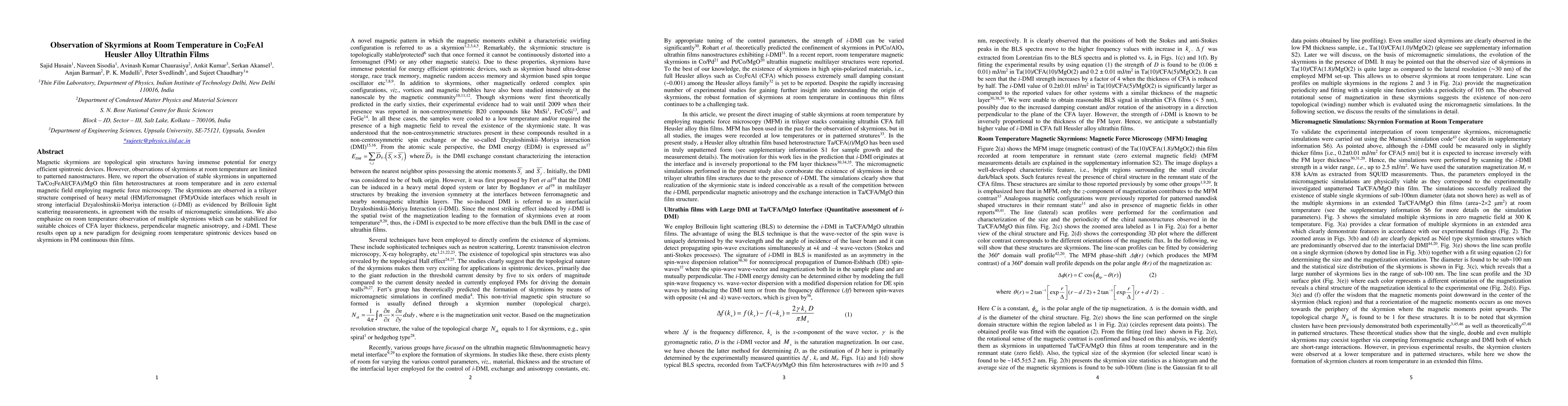 This paper reports the observation of stable magnetic skyrmions at room temperature in unpatterned Ta/Co2FeAl/MgO thin film heterostructures without external magnetic fields, facilitated by strong interfacial Dzyaloshinskii-Moriya interaction. The study highlights the potential for designing energy-efficient spintronic devices using these skyrmions in ferromagnetic thin films.