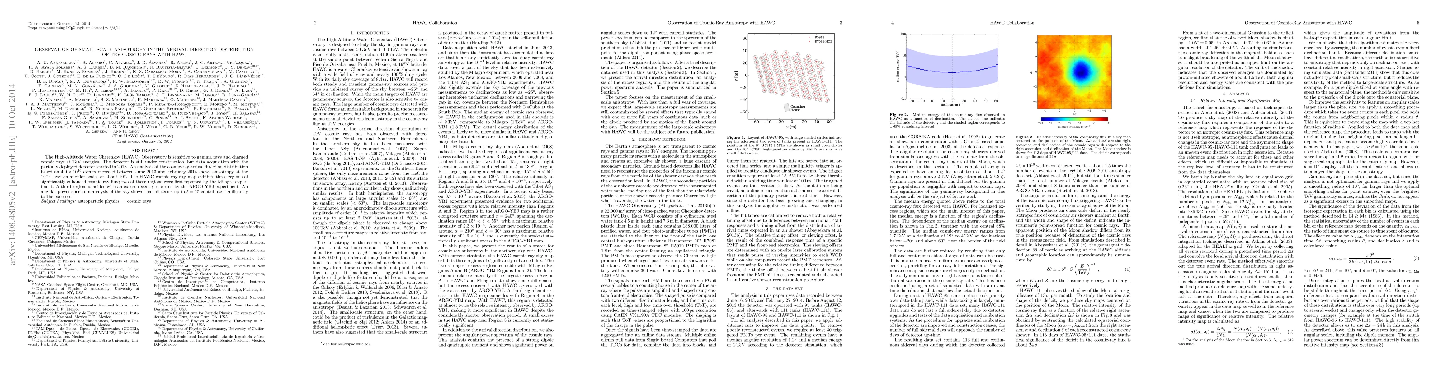The HAWC Observatory detected small-scale anisotropy in the arrival direction distribution of TeV cosmic rays, revealing enhanced flux regions and contributing to the understanding of cosmic ray anisotropy. The study identified three significant flux regions, two previously reported by the Milagro experiment and one by the ARGO-YBJ experiment.
