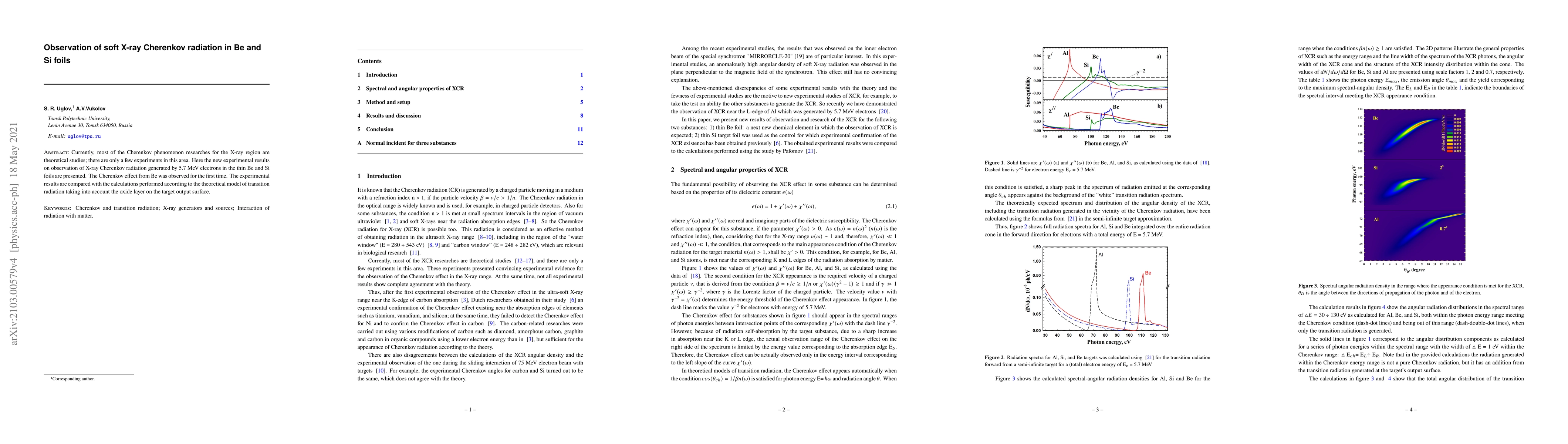 This paper reports the first experimental observation of soft X-ray Cherenkov radiation in beryllium (Be) and silicon (Si) foils using 5.7 MeV electrons, with Be showing Cherenkov effect for the first time. The results are compared with theoretical models considering the oxide layer on the target surface.