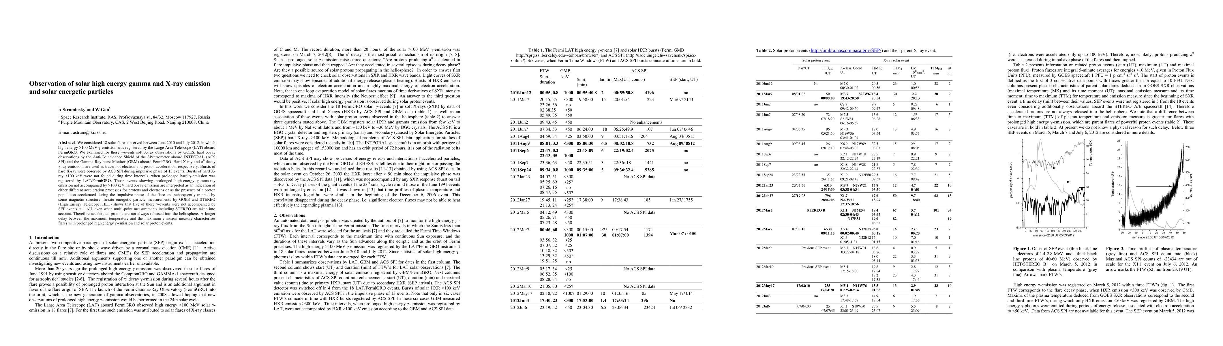 We considered 18 solar flares observed between June 2010 and July 2012, in which high energy >100 MeV {\gamma}-emission was registered by the Large Area Telescope (LAT) aboard FermiGRO. We examined for these {\gamma}-events soft X-ray observations by GOES, hard X-ray observations by the Anti-Coincidence Shield of the SPectrometer aboard INTEGRAL (ACS SPI) and the Gamma-Ray burst Monitor (GBM) aboard FermiGRO. Hard X-ray and {\pi}0-decay {\gamma}-ray emissions are used as tracers of electron and proton acceleration, respectively. Bursts of hard X-ray were observed by ACS SPI during impulsive phase of 13 events. Bursts of hard X-ray >100 keV were not found during time intervals, when prolonged hard {\gamma}-emission was registered by LAT/FermiGRO. Those events showing prolonged high-energy gamma-ray emission not accompanied by >100 keV hard X-ray emission are interpreted as an indication of either different acceleration processes for protons and electrons or as the presence of a proton population accelerated during the impulsive phase of the flare and subsequently trapped by some magnetic structure. In-situ energetic particle measurements by GOES and STEREO (High Energy Telescope, HET) shows that five of these {\gamma}-events were not accompanied by SEP events at 1 AU, even when multi-point measurements including STEREO are taken into account. Therefore accelerated protons are not always released into the heliosphere. A longer delay between the maximum temperature and the maximum emission measure characterises flares with prolonged high energy {\gamma}-emission and solar proton events.
