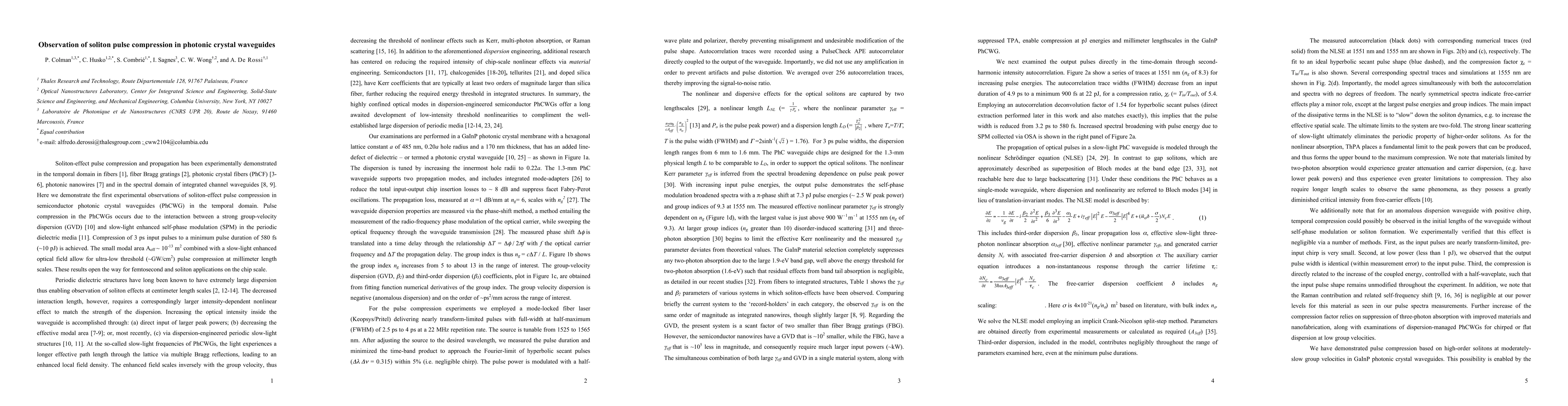 This study observes soliton-induced pulse compression in photonic crystal waveguides, achieving a reduction from 3 ps to 580 fs using strong anomalous dispersion and self-phase modulation, with minimal pulse energy of ~10 pJ. The compression is measured via autocorrelation techniques.