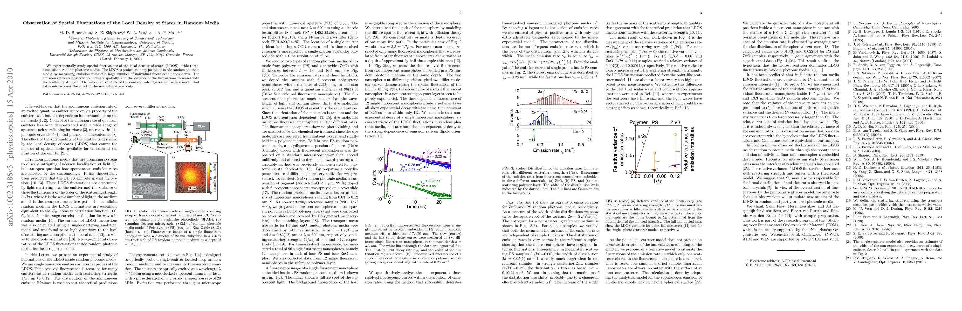 We experimentally study spatial fluctuations of the local density of states (LDOS) inside three-dimensional random photonic media. The LDOS is probed at many positions inside the random photonic media by measuring emission rates of a large number of individual fluorescent nanospheres. The emission rates are observed to fluctuate spatially. We analyze the variance of these fluctuations for samples with different scattering strengths. The measured variance of the emission rates agrees well with a model that takes into account the effect of the nearest scatterer only.