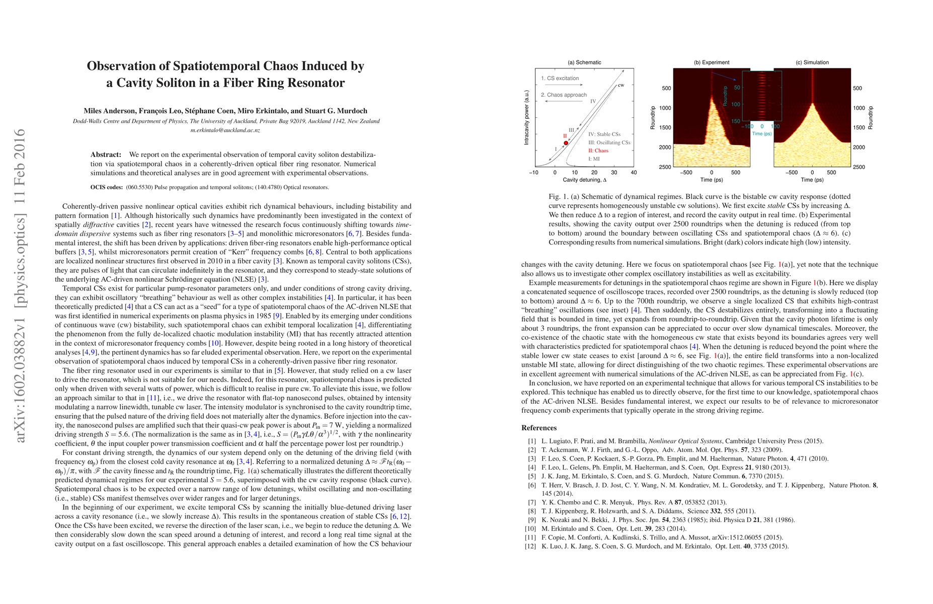 Summary: This paper reports the experimental observation of spatiotemporal chaos induced by a cavity soliton in a fiber ring resonator, with numerical simulations and theoretical analyses corroborating the findings. The study highlights the temporal destabilization of solitons under coherent driving conditions.