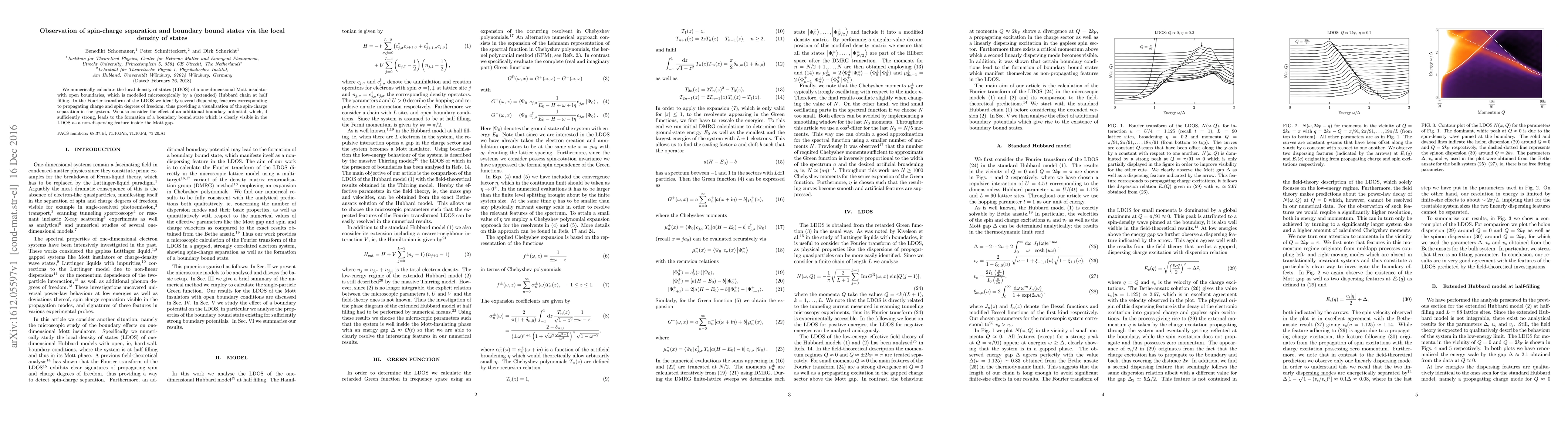 This paper numerically investigates a one-dimensional Mott insulator using local density of states (LDOS) to visualize spin-charge separation and boundary bound states. The study reveals distinct dispersing features corresponding to charge and spin, and a strong boundary potential induces a non-dispersing boundary bound state within the Mott gap.
