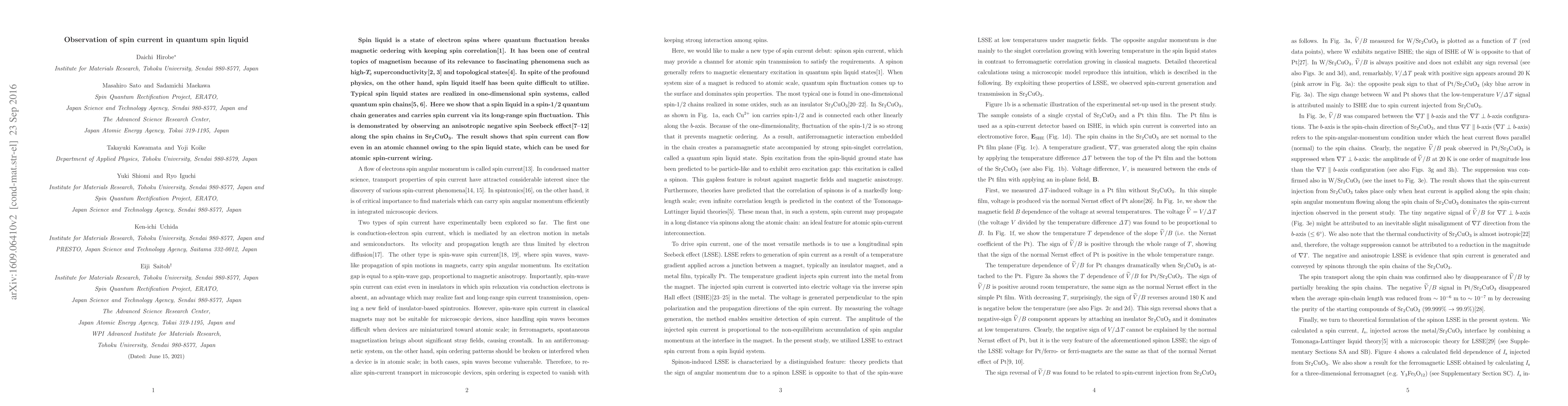 Spin liquid is a state of electron spins in which quantum fluctuation breaks magnetic ordering while maintaining spin correlation. It has been a central topic in magnetism because of its relevance to high-Tc superconductivity and topological states. However, utilizing spin liquid has been quite difficult. Typical spin liquid states are realized in one-dimensional spin systems, called quantum spin chains. Here, we show that a spin liquid in a spin-1/2 quantum chain generates and carries spin current via its long-range spin fluctuation. This is demonstrated by observing an anisotropic negative spin Seebeck effect along the spin chains in Sr2CuO3. The results show that spin current can flow even in an atomic channel owing the spin liquid state, which can be used for atomic spin-current wiring.