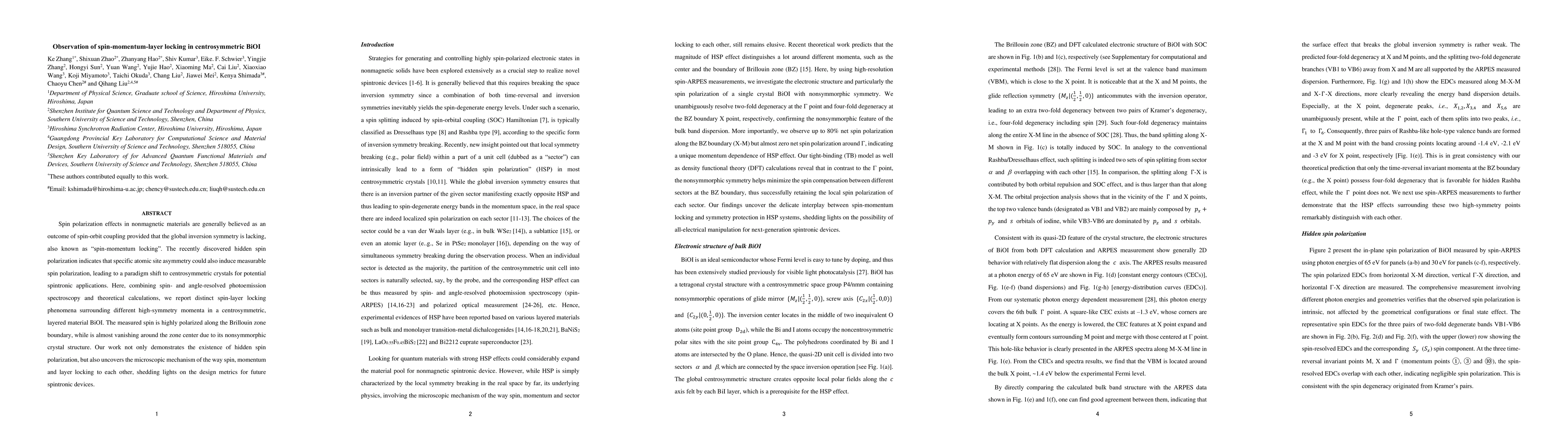 This paper reports the observation of spin-momentum-layer locking in centrosymmetric BiOI using spin- and angle-resolved photoemission spectroscopy and theoretical calculations. The study reveals distinct spin polarization along the Brillouin zone boundary, highlighting hidden spin polarization and its microscopic mechanisms, which could inform the design of future spintronic devices.