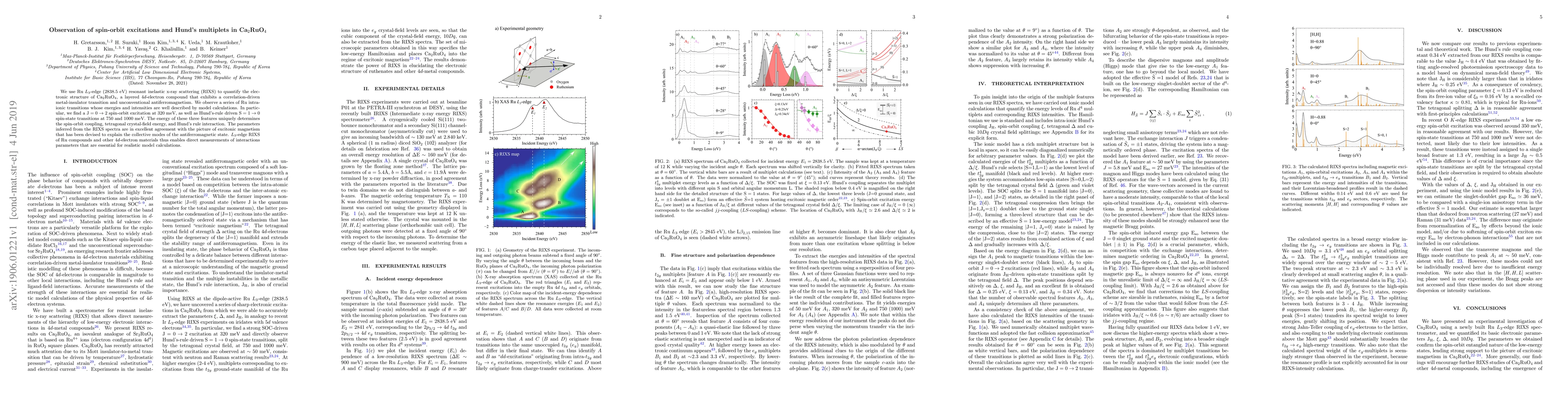 We use Ru $L_3$-edge (2838.5 eV) resonant inelastic x-ray scattering (RIXS) to quantify the electronic structure of Ca$_2$RuO$_4$, a layered $4d$-electron compound that exhibits a correlation-driven metal-insulator transition and unconventional antiferromagnetism. We observe a series of Ru intra-ionic transitions whose energies and intensities are well described by model calculations. In particular, we find a $\rm{J}=0\rightarrow 2$ spin-orbit excitation at 320 meV, as well as Hund's-rule driven $\rm{S}=1\rightarrow 0$ spin-state transitions at 750 and 1000 meV. The energy of these three features uniquely determines the spin-orbit coupling, tetragonal crystal-field energy, and Hund's rule interaction. The parameters inferred from the RIXS spectra are in excellent agreement with the picture of excitonic magnetism that has been devised to explain the collective modes of the antiferromagnetic state. $L_3$-edge RIXS of Ru compounds and other $4d$-electron materials thus enables direct measurements of interactions parameters that are essential for realistic model calculations.