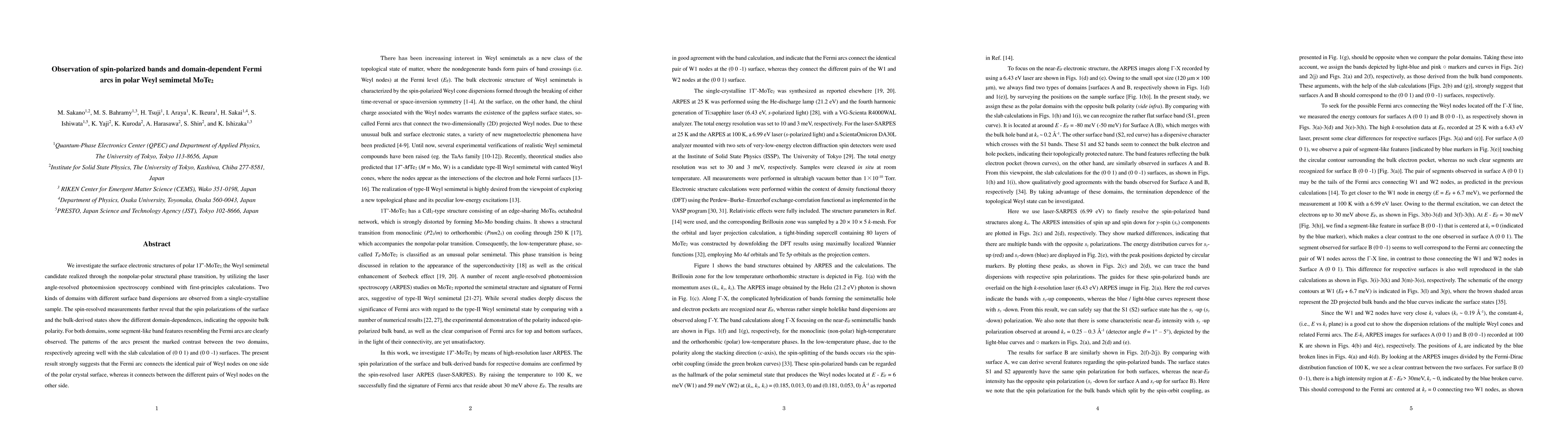 We investigate the surface electronic structures of polar 1T'-MoTe2, the Weyl semimetal candidate realized through the nonpolar-polar structural phase transition, by utilizing the laser angle-resolved photoemission spectroscopy (ARPES) combined with first-principles calculations. Two kinds of domains with different surface band dispersions are observed from a single-crystalline sample. The spin-resolved measurements further reveal that the spin polarizations of the surface and the bulk-derived states show the different domain-dependences, indicating the opposite bulk polarity. For both domains, some segment-like band features resembling the Fermi arcs are clearly observed. The patterns of the arcs present the marked contrast between the two domains, respectively agreeing well with the slab calculation of (0 0 1) and (0 0 -1) surfaces. The present result strongly suggests that the Fermi arc connects the identical pair of Weyl nodes on one side of the polar crystal surface, whereas it connects between the different pairs of Weyl nodes on the other side.