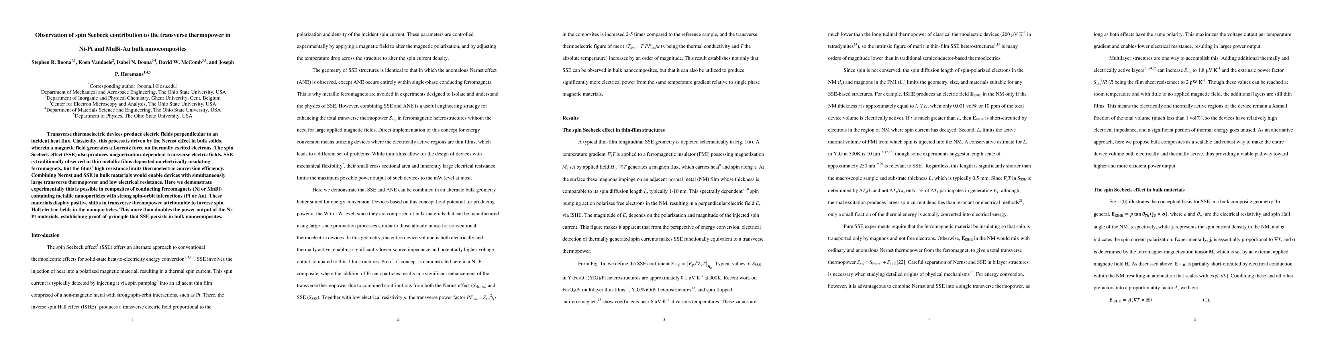 This paper demonstrates that combining the spin Seebeck effect (SSE) with the Nernst effect in bulk nanocomposites of Ni-Pt and MnBi-Au results in significant positive shifts in transverse thermopower, more than doubling the power output of Ni-Pt materials and proving the persistence of SSE in such composites.