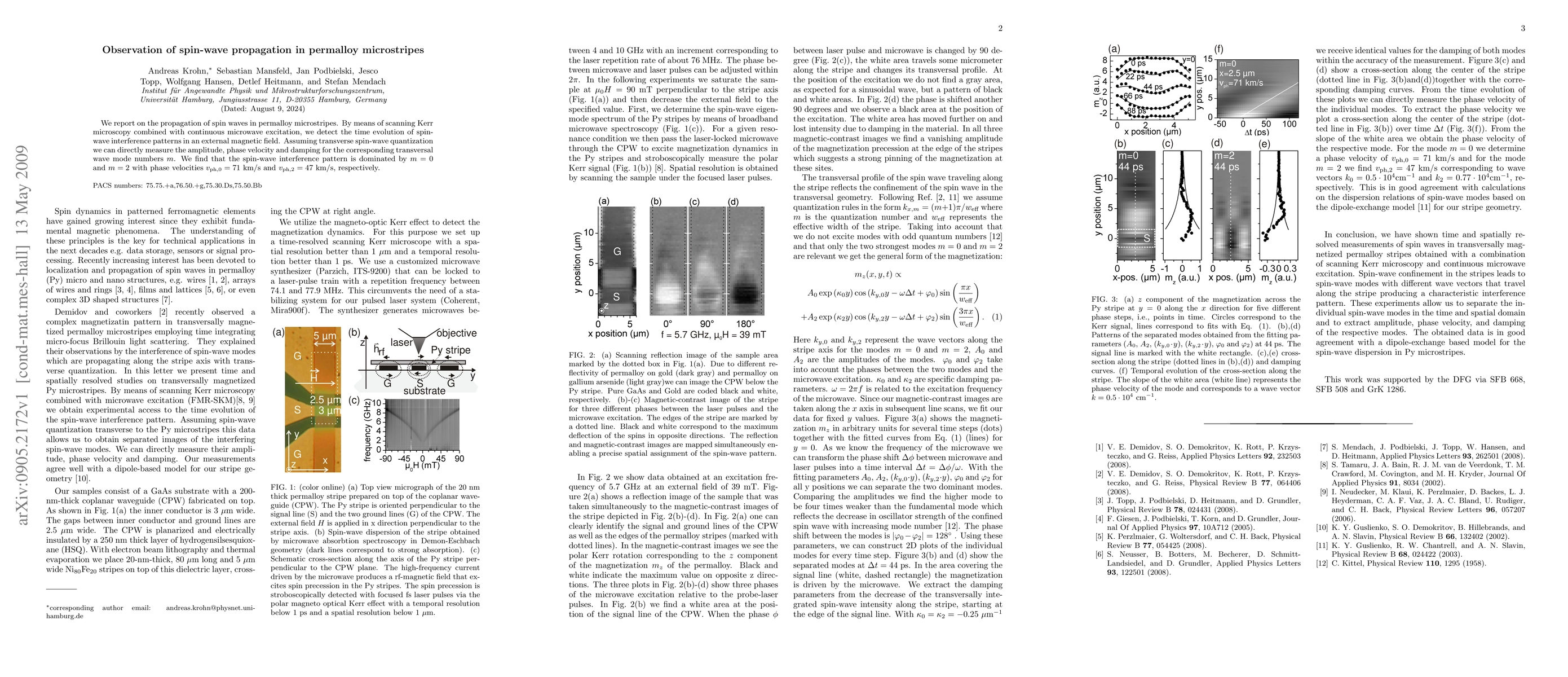 We report on the propagation of spin waves in permalloy microstripes. By means of scanning Kerr microscopy combined with continuous microwave excitation, we detect the time evolution of spin-wave interference patterns in an external magnetic field. Assuming transverse spin-wave quantization we can directly measure the amplitude, phase velocity and damping for the corresponding transversal wave mode numbers m. We find that the spin-wave interference pattern is dominated by m=0 and m=2 with phase velocities v_0=71 km/s and v_2=47 km/s, respectively.