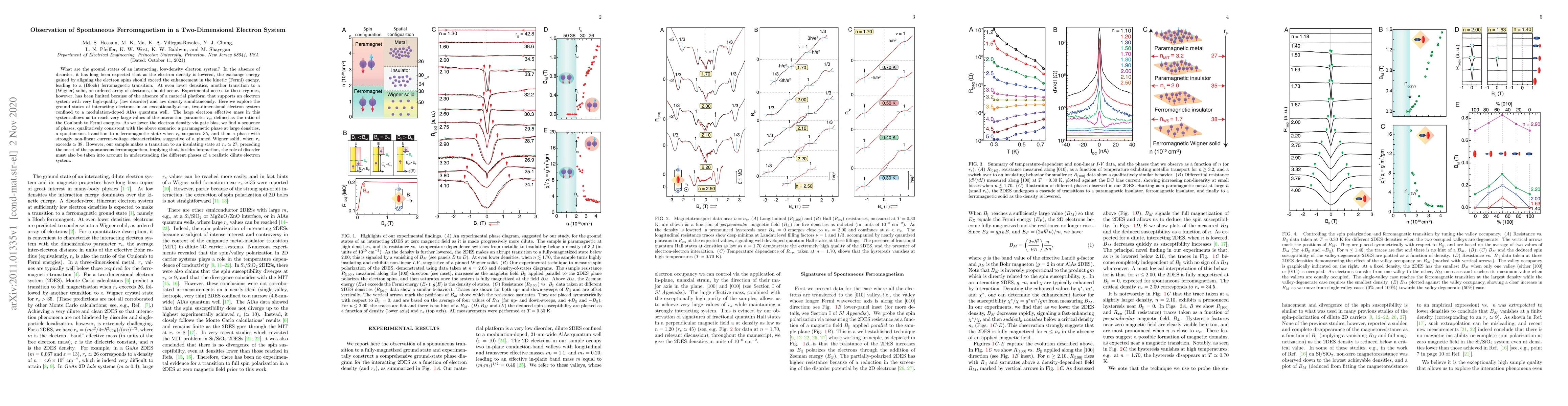 This paper observes spontaneous ferromagnetism in a clean, low-density two-dimensional electron system in an AlAs quantum well, finding a transition to ferromagnetism at high interaction parameters. The study also highlights the importance of disorder in determining the phases of such systems, noting an insulating transition before the onset of ferromagnetism.