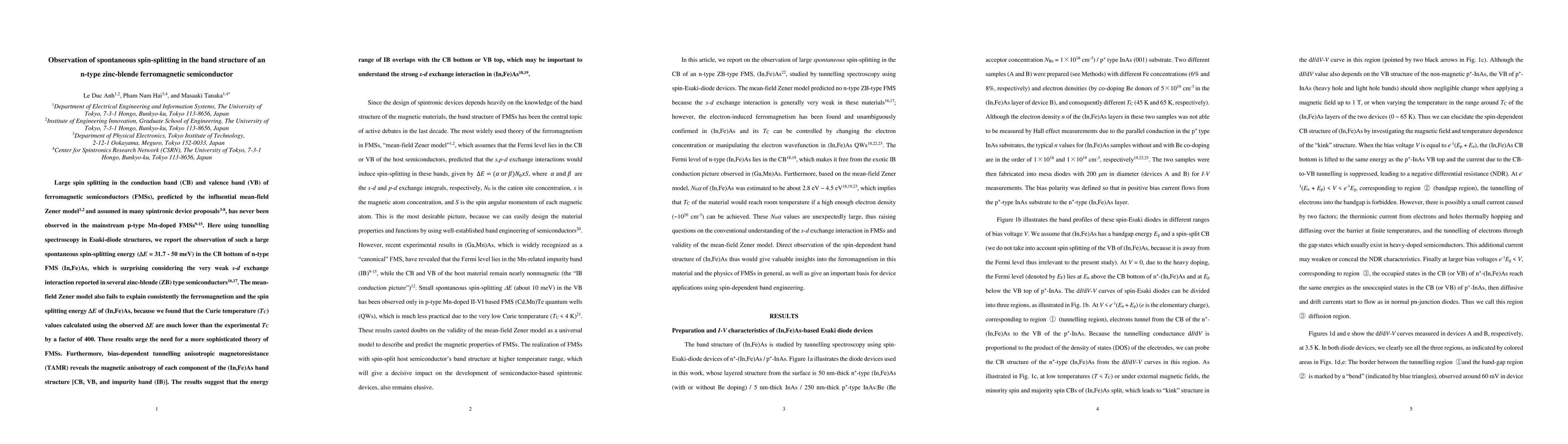 This paper reports the first observation of large spontaneous spin-splitting in the conduction and valence bands of n-type (In,Fe)As using tunnelling spectroscopy, challenging existing theories like the mean-field Zener model. The findings suggest a need for a more sophisticated theory to explain ferromagnetism and spin splitting in such materials.