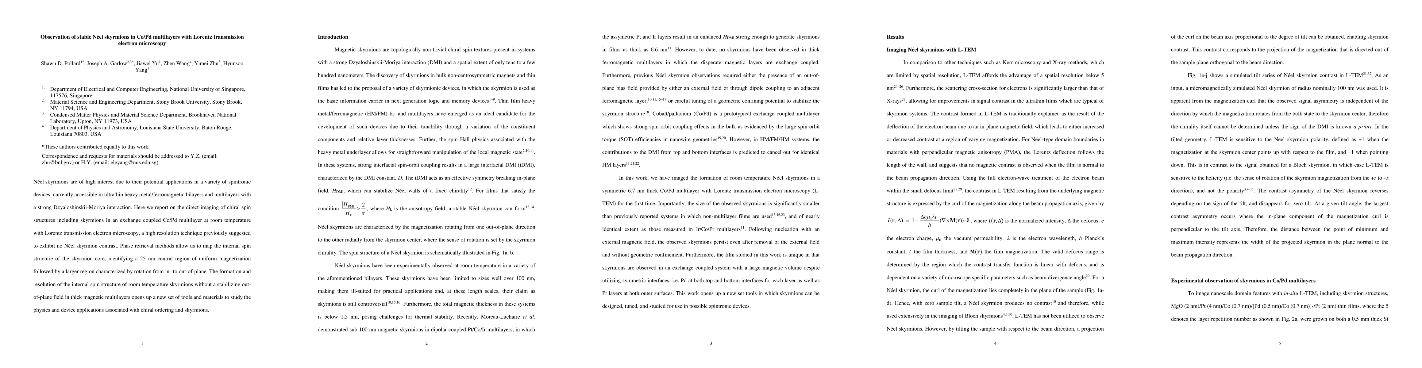 This paper reports the direct observation of stable Neel skyrmions in Co/Pd multilayers using Lorentz transmission electron microscopy, revealing a detailed internal spin structure and suggesting new material options for spintronic devices. The findings demonstrate the potential of these multilayers to support skyrmions at room temperature without external magnetic fields.
