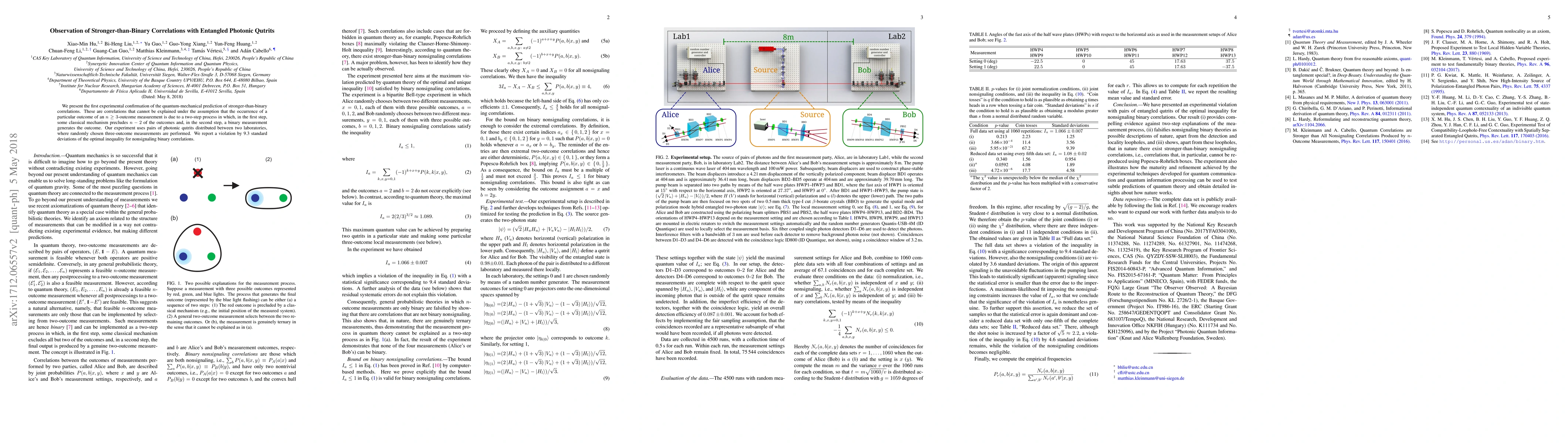 This paper experimentally confirms quantum-mechanical predictions of stronger-than-binary correlations using entangled photonic qutrits, demonstrating a 9.3 standard deviation violation of the optimal inequality for nonsignaling binary correlations. This finding supports the existence of correlations beyond classical two-step processes.